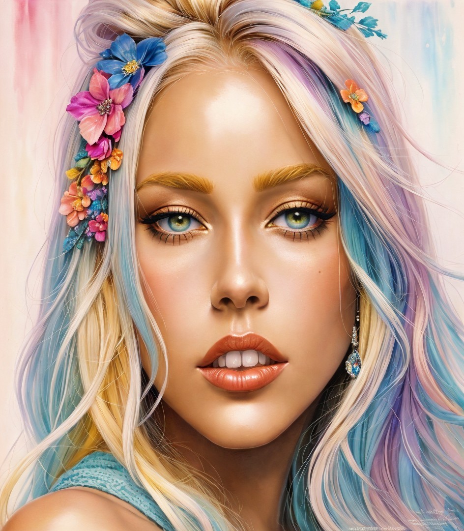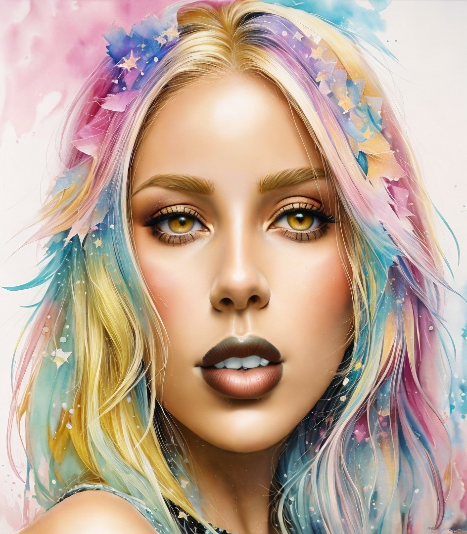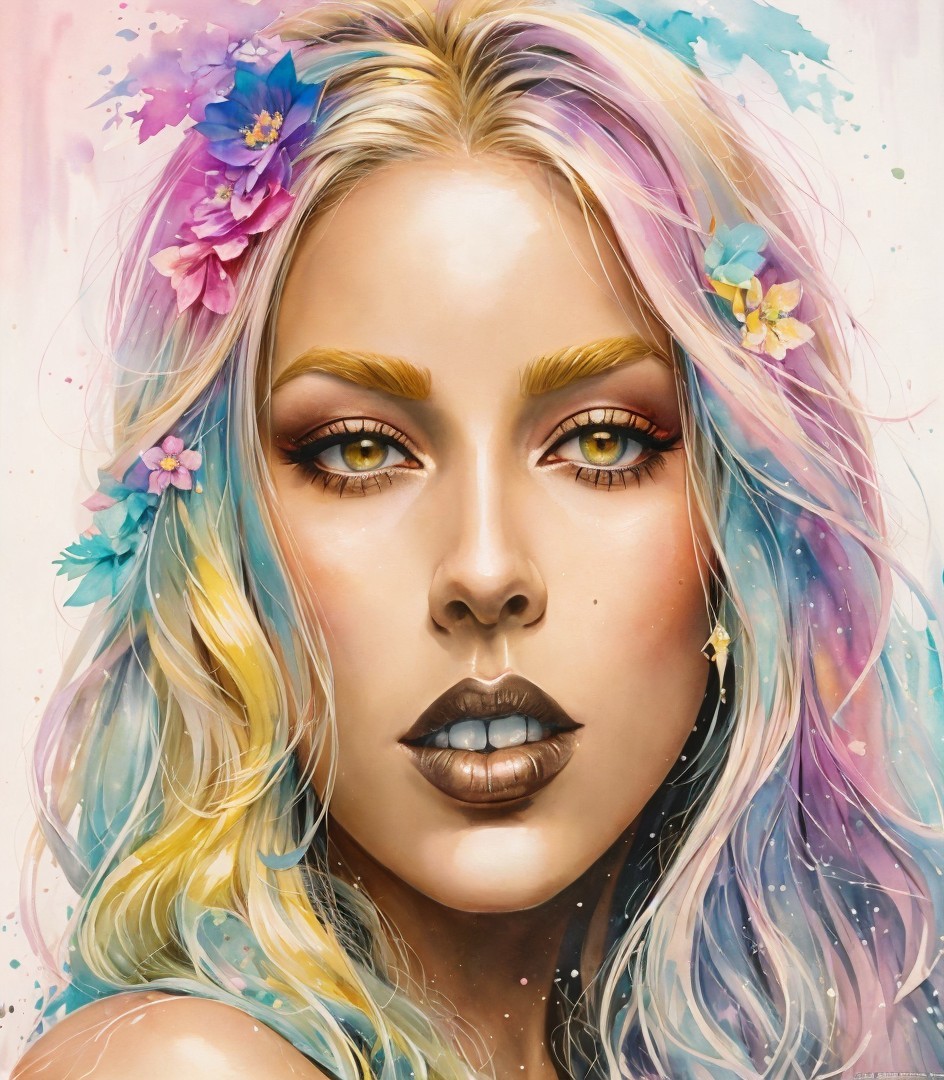 Portrait of gorgeous female rapper with blonde crystalline hairdo, american gothic 1.7, tints of 1990s movie poster art, style by Meghan Duncanson and Jennifer Lommers and Didier Lourenço, anglogothic 1.6, wavery watercolor and ink splashes 1.9, style of1970s advertising art and streetart, stylized chipped portraiture, beautiful female face, ornamental details, plushy, lavish, 3d effects 1.8, shadow mapping 1.3, dynamic lighting 1.7, ambient occlusion 1.5, anisotropic filtering 1.7, dimmed dynamic lighting, wavery texture, tints of sketch art, intricate ochre hairdo with lineage, raytraced shadows 1.8, triadic colour scheme pink brown yellow, creamy, , cottagegore 1.9, retrofuturistic details, Streamline_Moderne, anisotropic filtering 1.7, grunge, acid spill, beautiful composition 1.9, coffinwood 1.7, hues, quilling, quaint, synthetic, retropunk details, lavish, tints of dark fantasy art, beautiful artwork, stylized illustration 1.5, vaporous lighting, intricate flares, high coloring 1.9, stylized artwork, zentangle method, Pastel colors of lemon ochre amber, octane render, texture painting