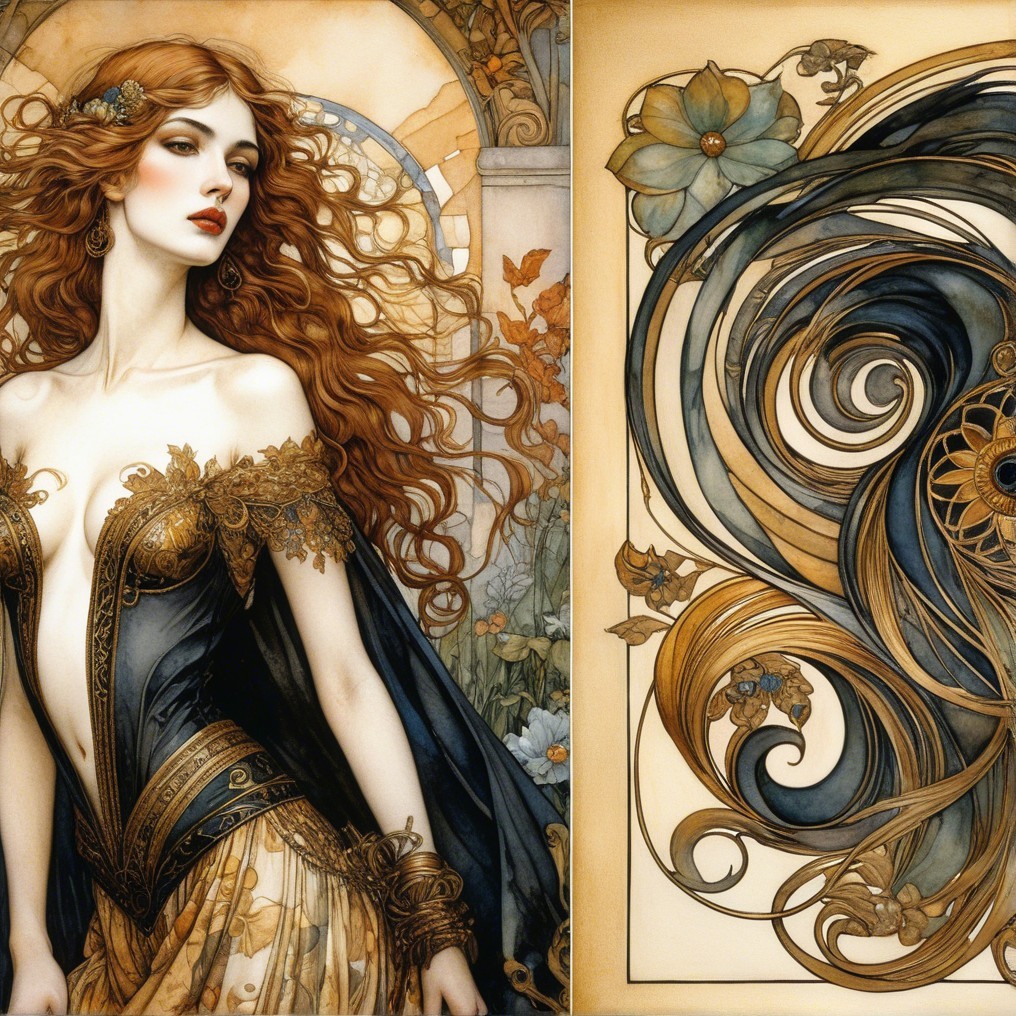 The artwork features two elegant women with distinct hairstyles and outfits. One has flowing red hair and a gown adorned with floral patterns, while the other has dark, intricate hair and a jeweled accessory.
