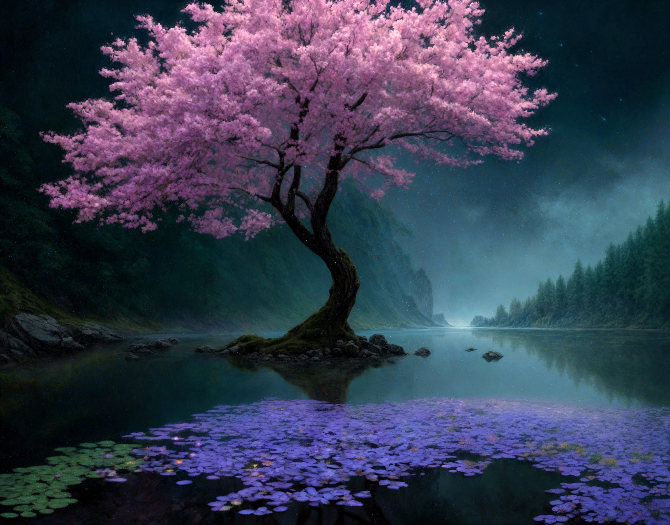 A serene landscape features a blooming pink tree beside a calm lake, with purple water lilies floating on the surface. Misty mountains and a starry sky create a tranquil atmosphere.