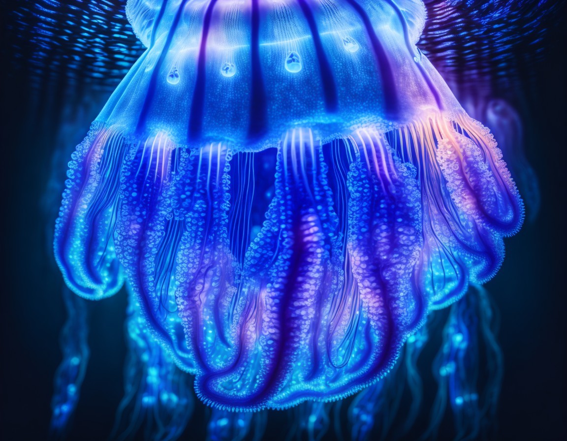 A vibrant digital image of a bioluminescent jellyfish glowing in hues of blue and pink against a dark underwater backdrop. Dont got what I what.