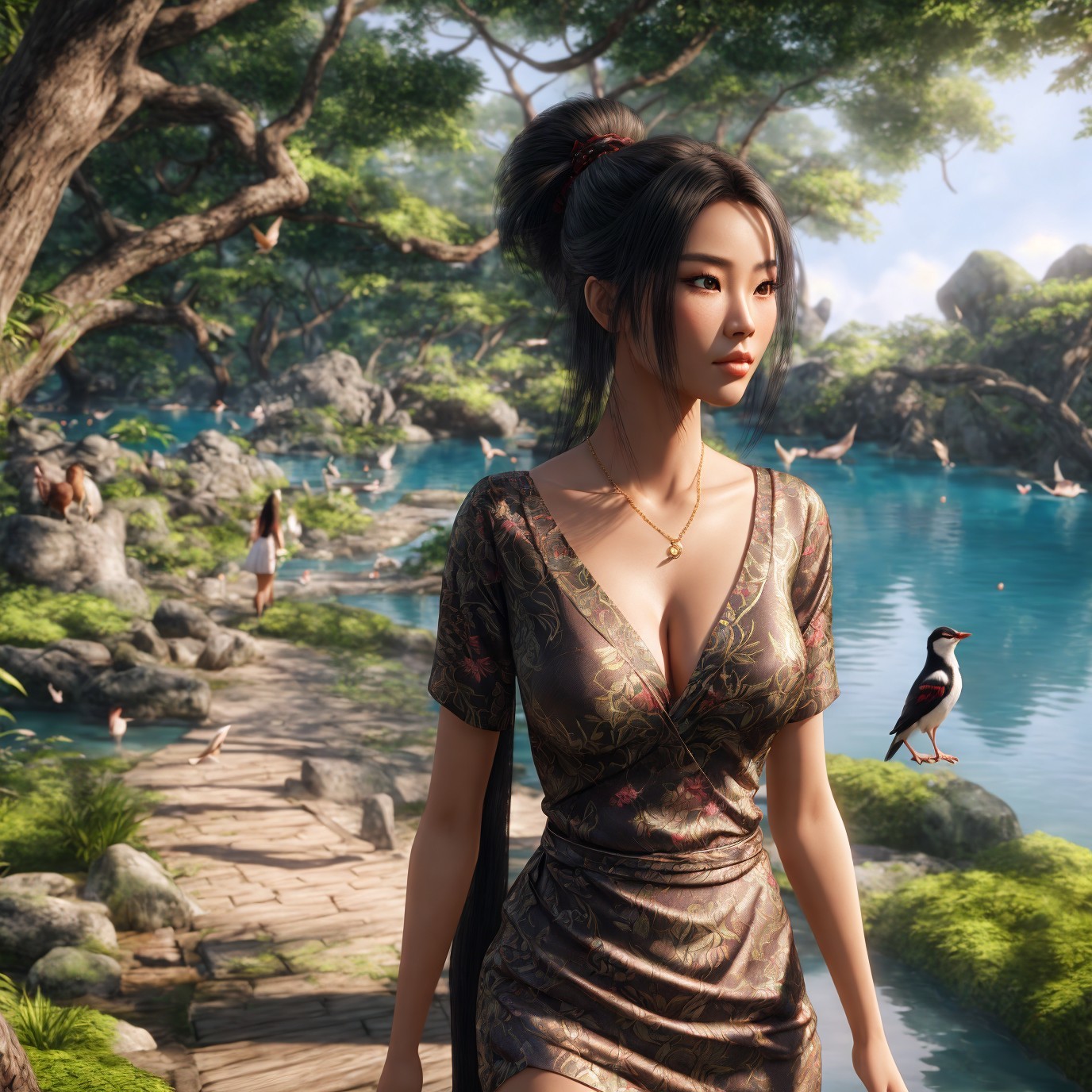 A digital artwork depicting a woman in a traditional dress standing on a wooden jetty in a serene, forested lakeside setting.