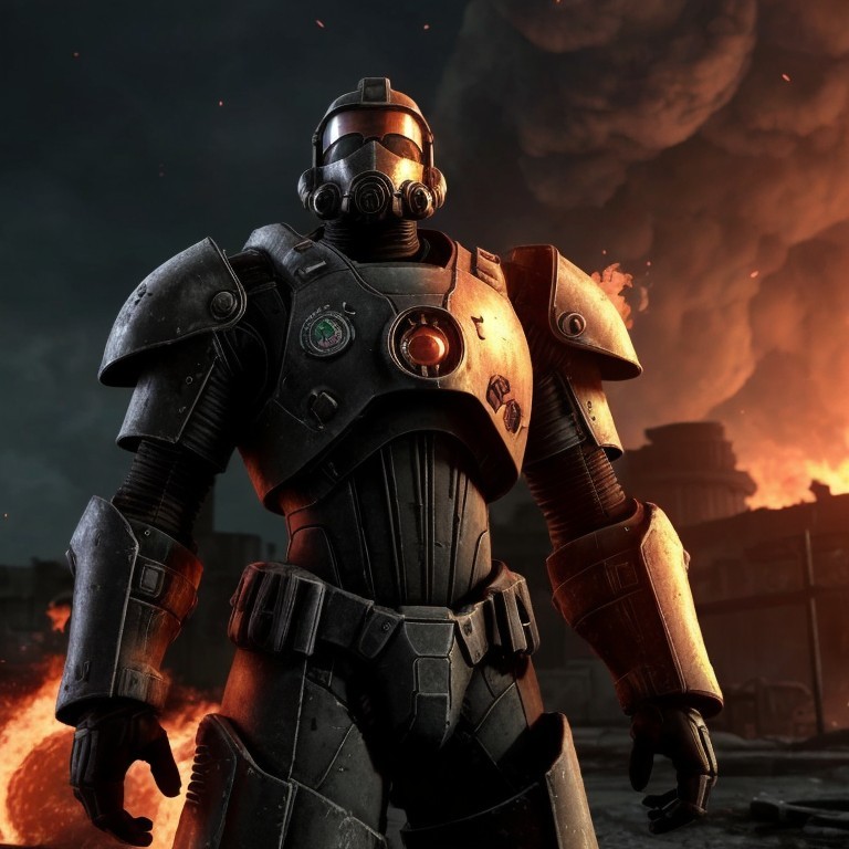 A futuristic armored soldier with a gas mask stands before an explosion in a dystopian setting.