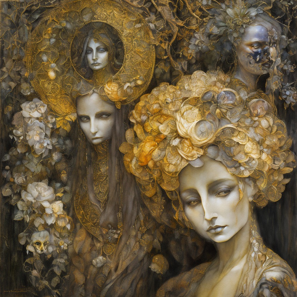 A surreal portrait blending a woman's face with an owl, adorned with autumn leaves and pearls, amidst classical architecture.