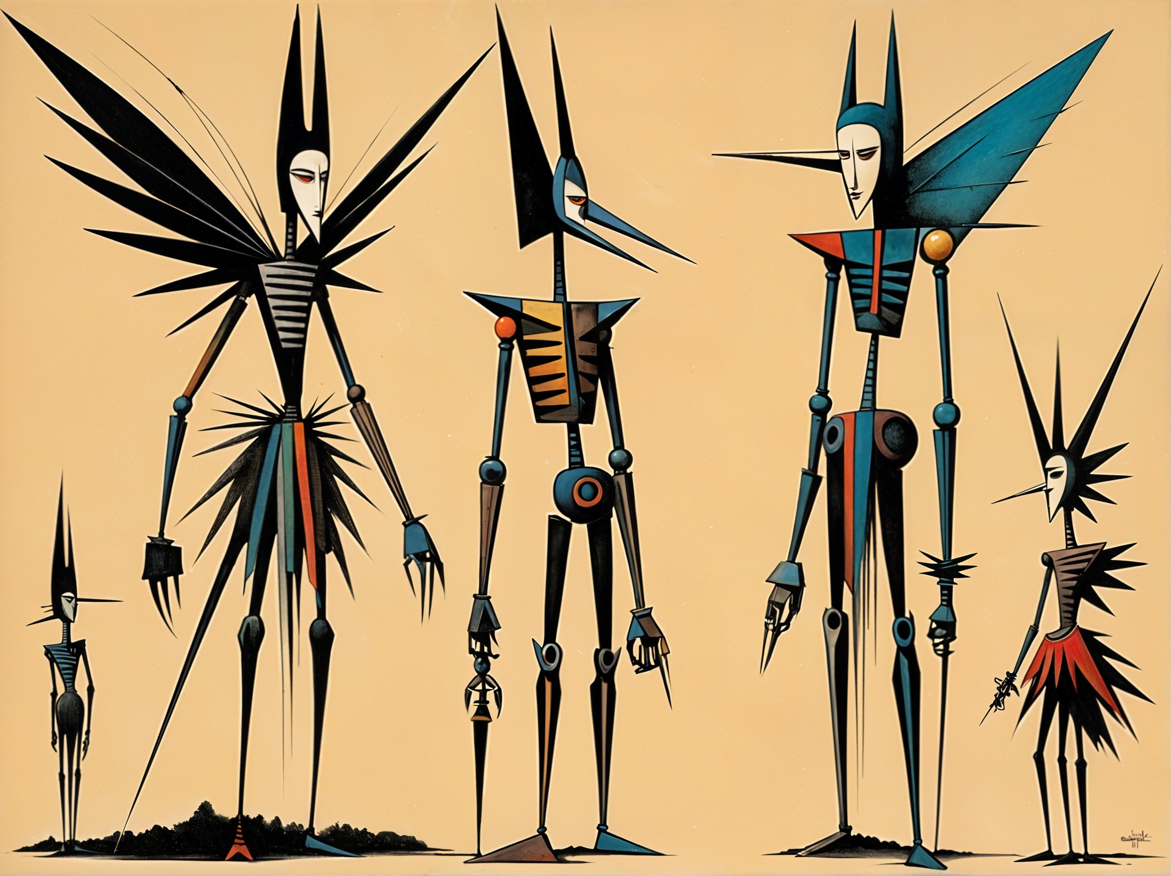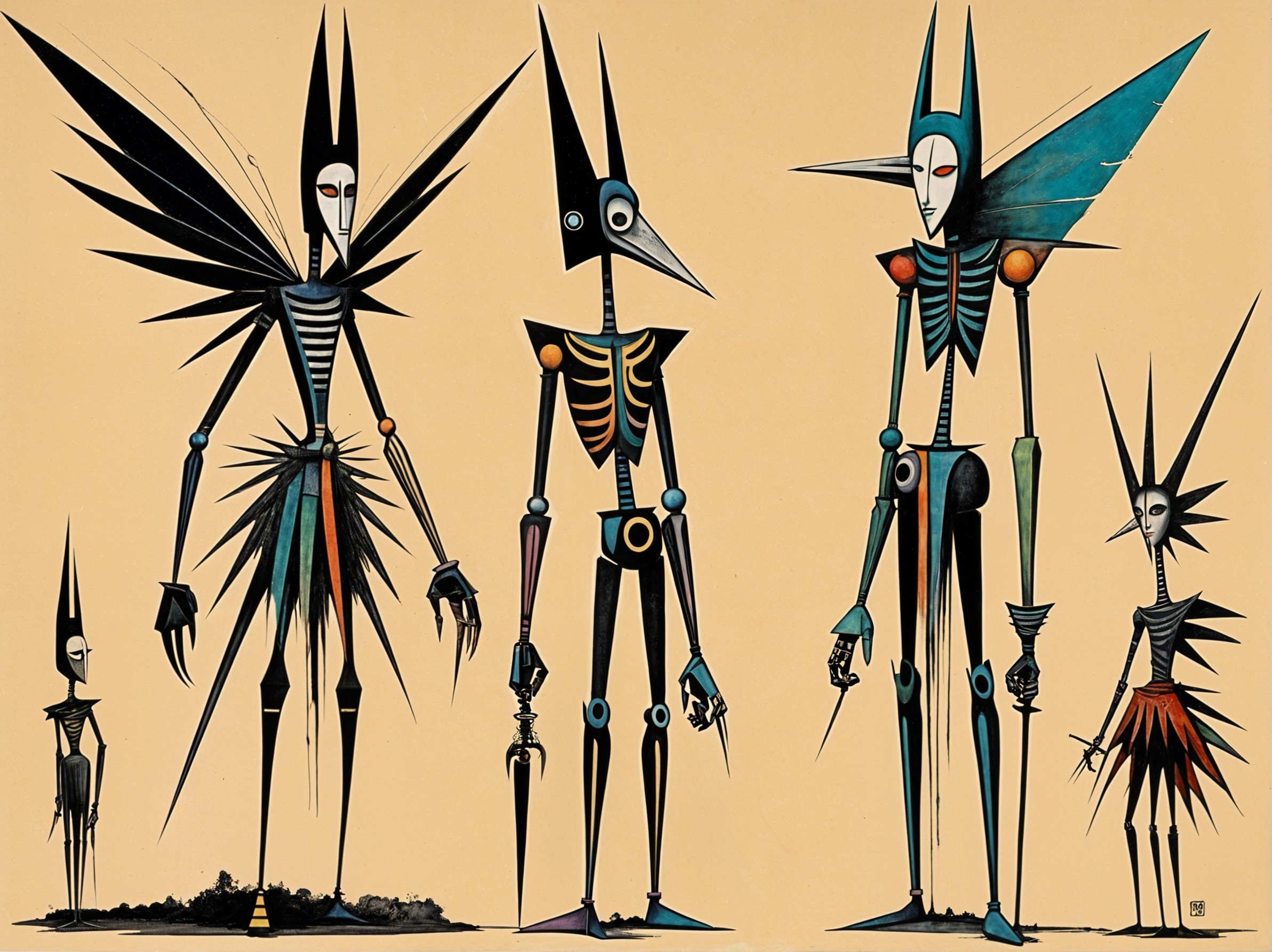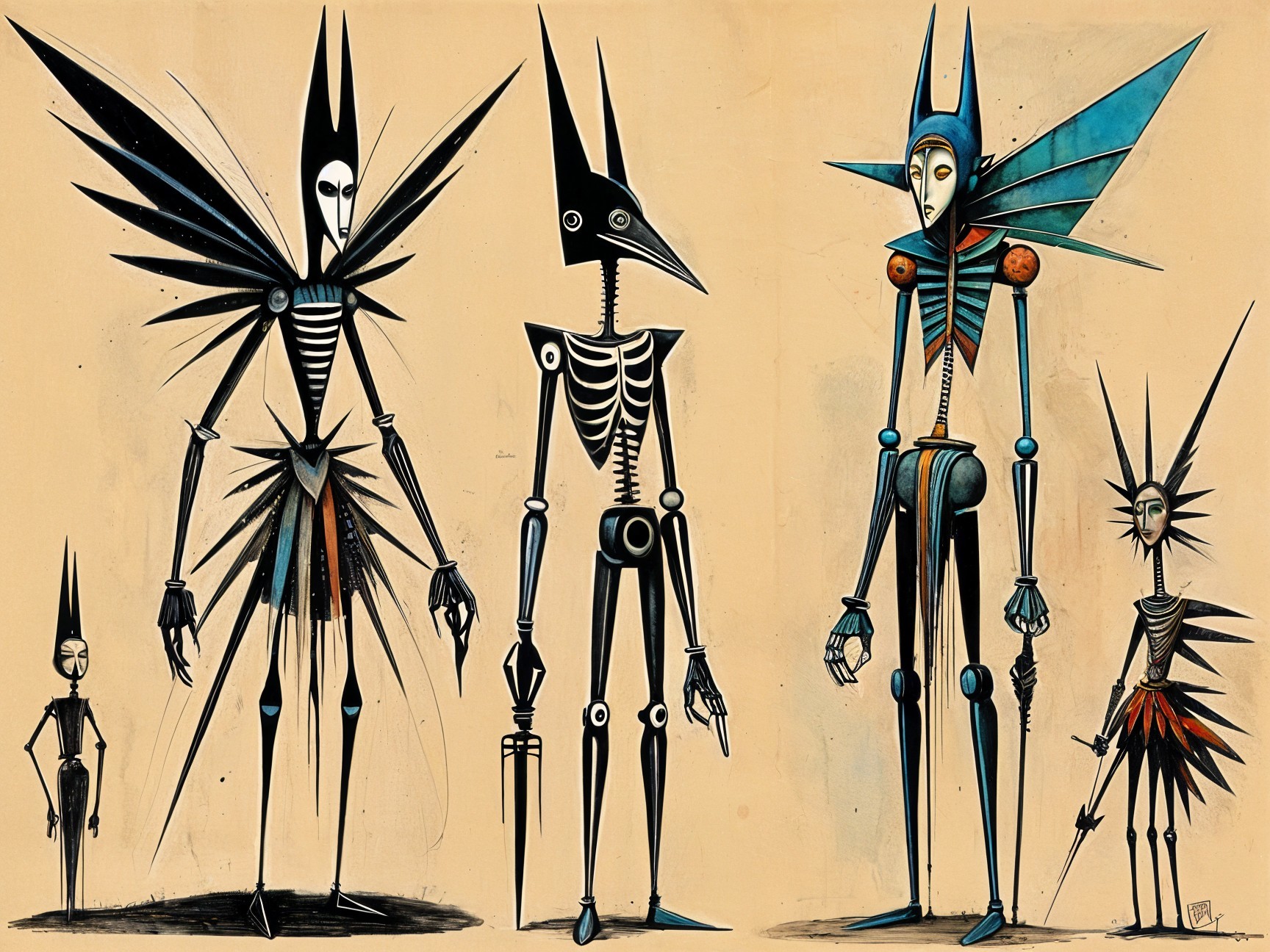 Three ethereal figures with butterfly wings and flowing garments stand together. Their designs blend elegance and fantasy, featuring intricate details and a striking color palette of blues and blacks.