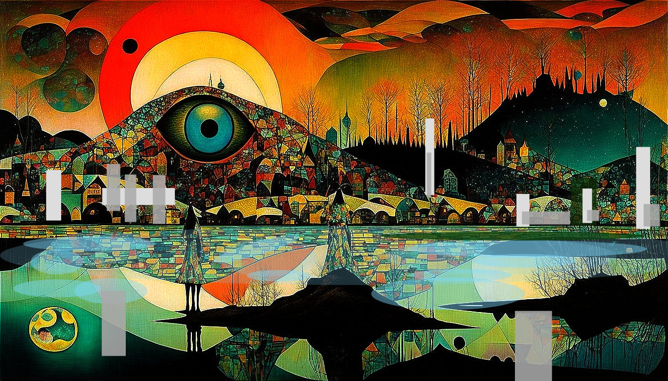 A serene landscape features a serene river surrounded by rolling hills and colorful houses under a vivid sunset. A cloaked figure sits by the water, adding an air of mystery to the tranquil scene.