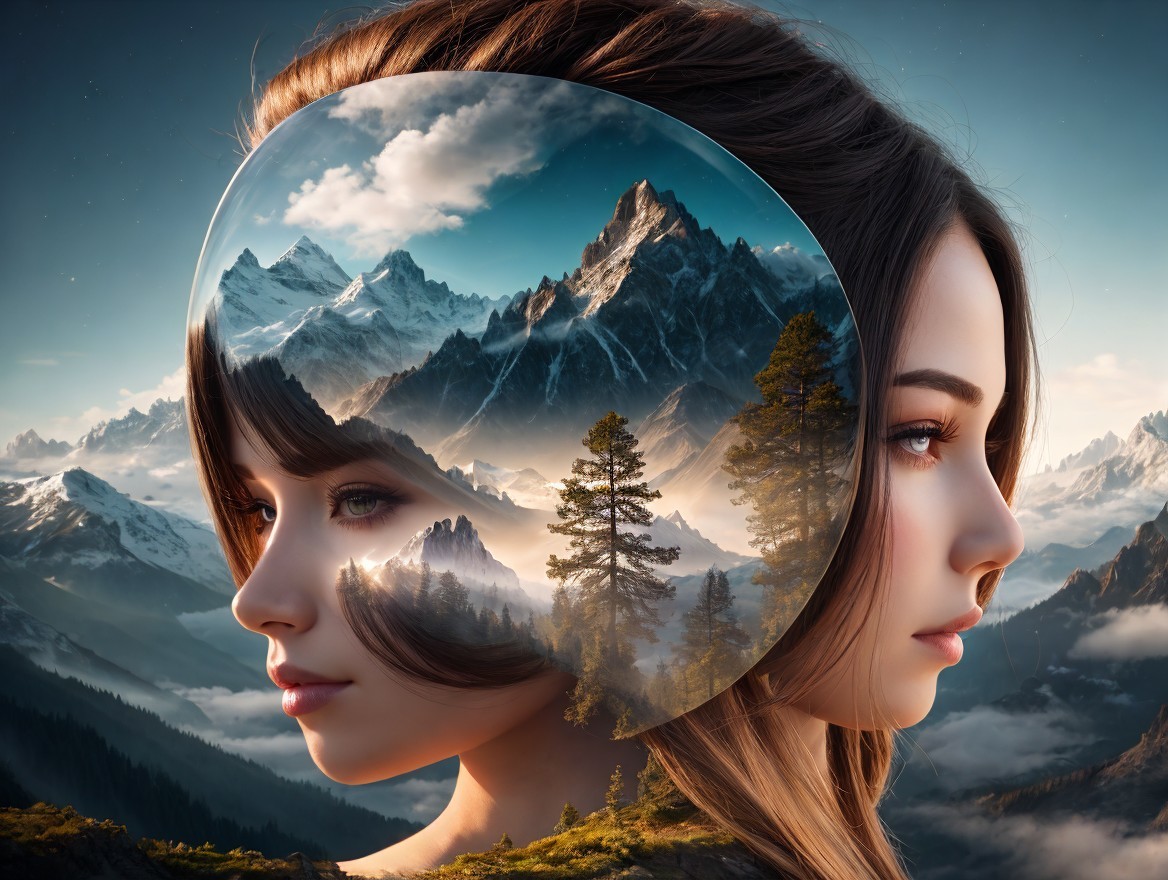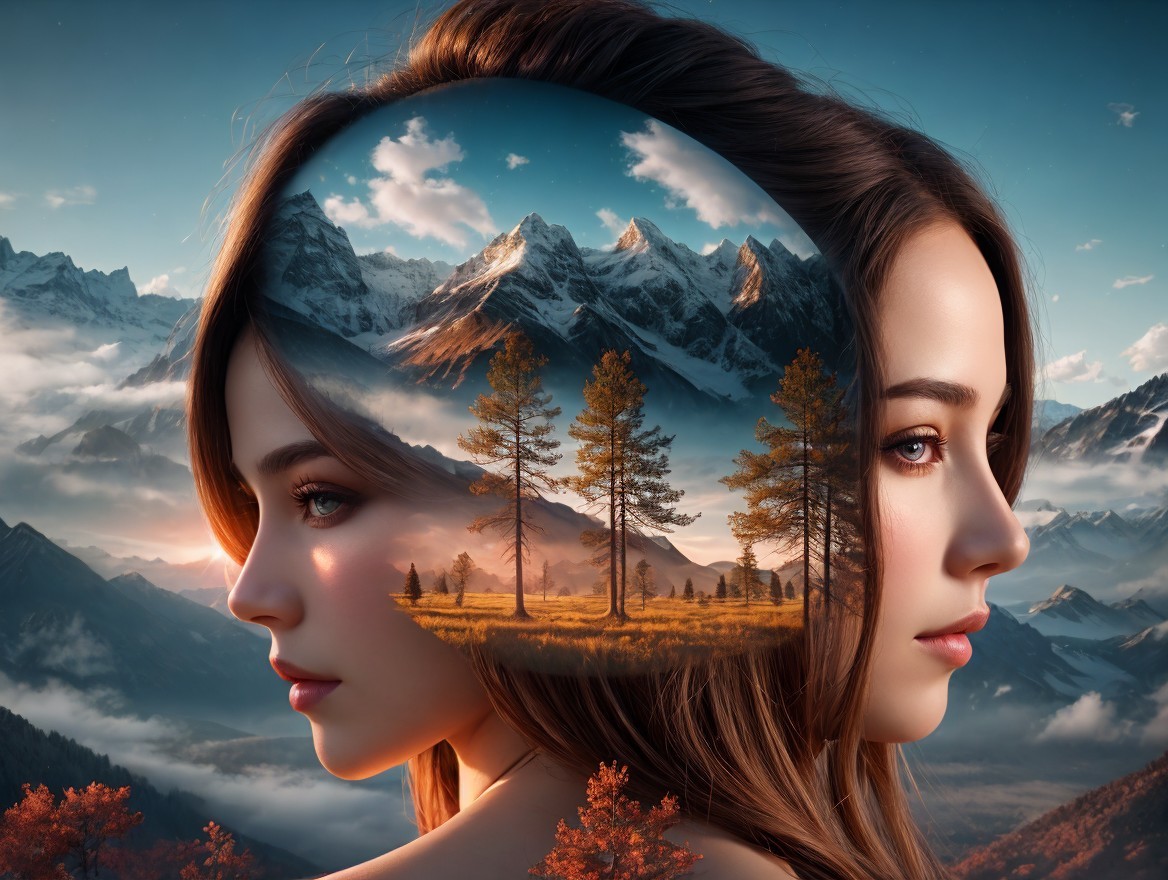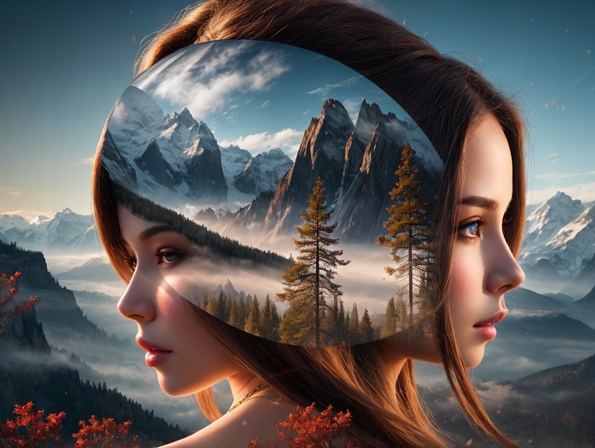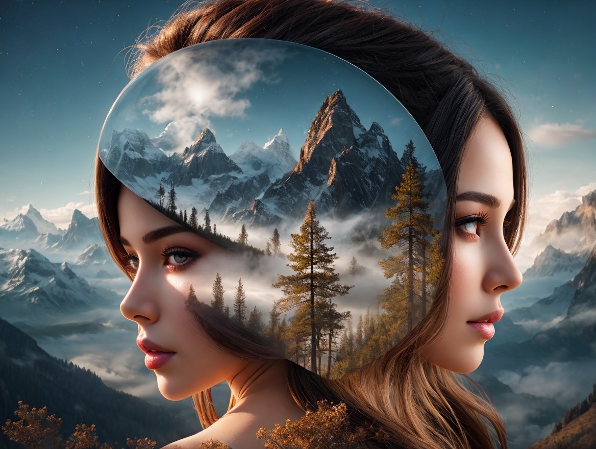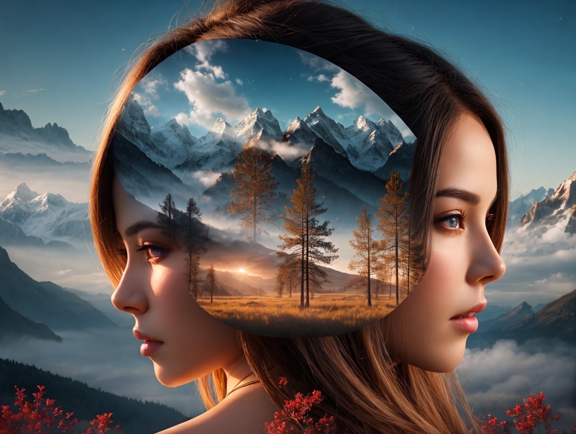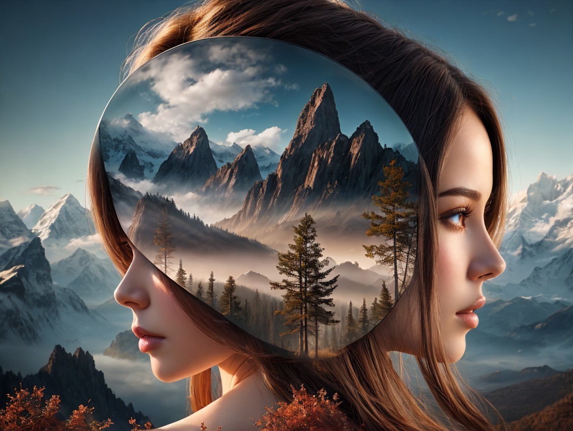 The image features a serene landscape reflected in the profile of a woman. Majestic mountains and autumn trees create a dreamlike scene, blending nature with her tranquil expression.