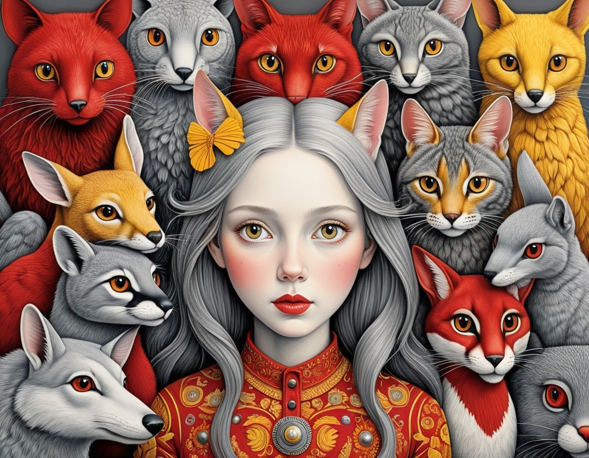 A surreal portrait of a pale woman surrounded by colorful, anthropomorphic foxes and cats with intense gazes.