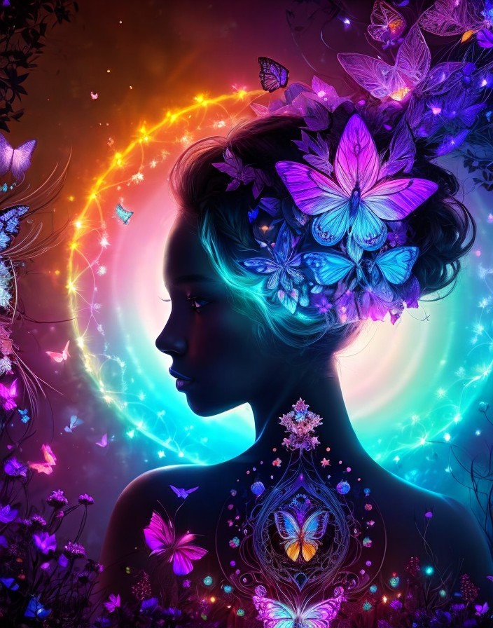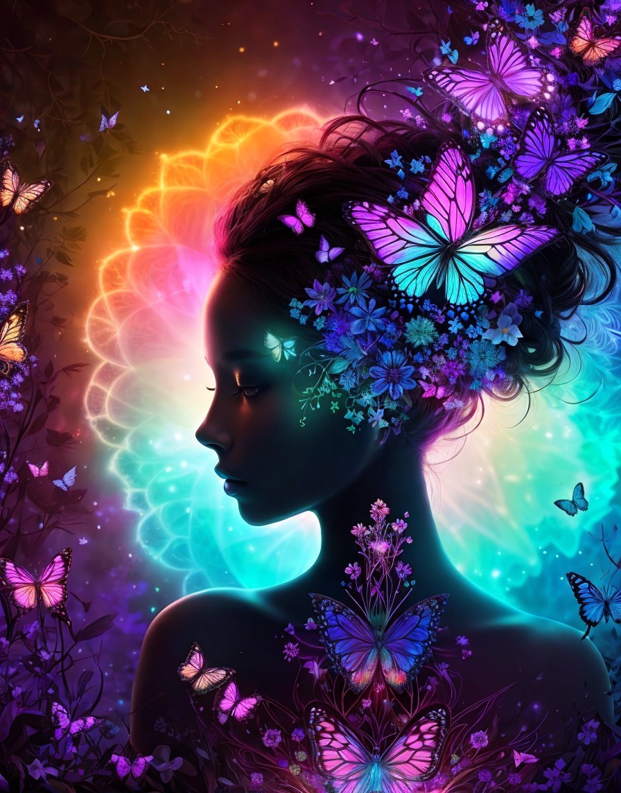 A vibrant digital artwork of a woman with butterflies in her hair, immersed in a kaleidoscope of neon colors.