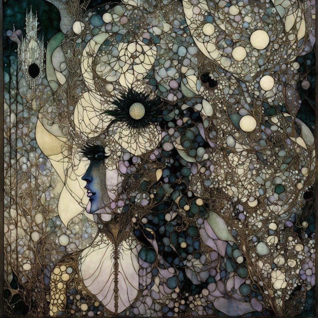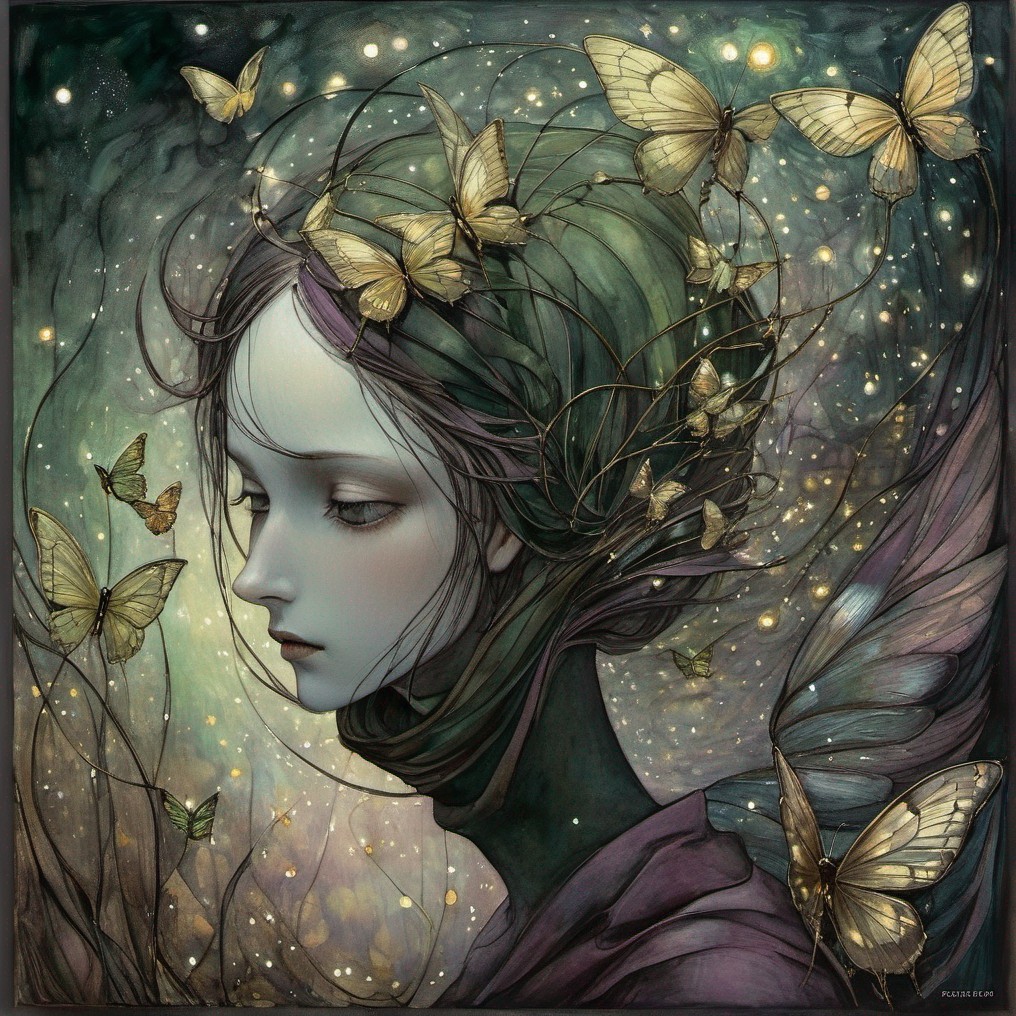 A serene woman with a green headwrap surrounded by golden butterflies against a moody, dark botanical backdrop.