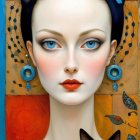 A stylized portrait features a woman with cat-like ears, striking blue eyes, and bold red lips. She's surrounded by two cats, set against a vibrant orange floral background.