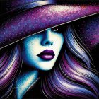 A stunning close-up of a woman with vibrant makeup, featuring striking blue eyes and bold purple lips. She wears a glossy pink hat adorned with raindrops, set against a dark backdrop.