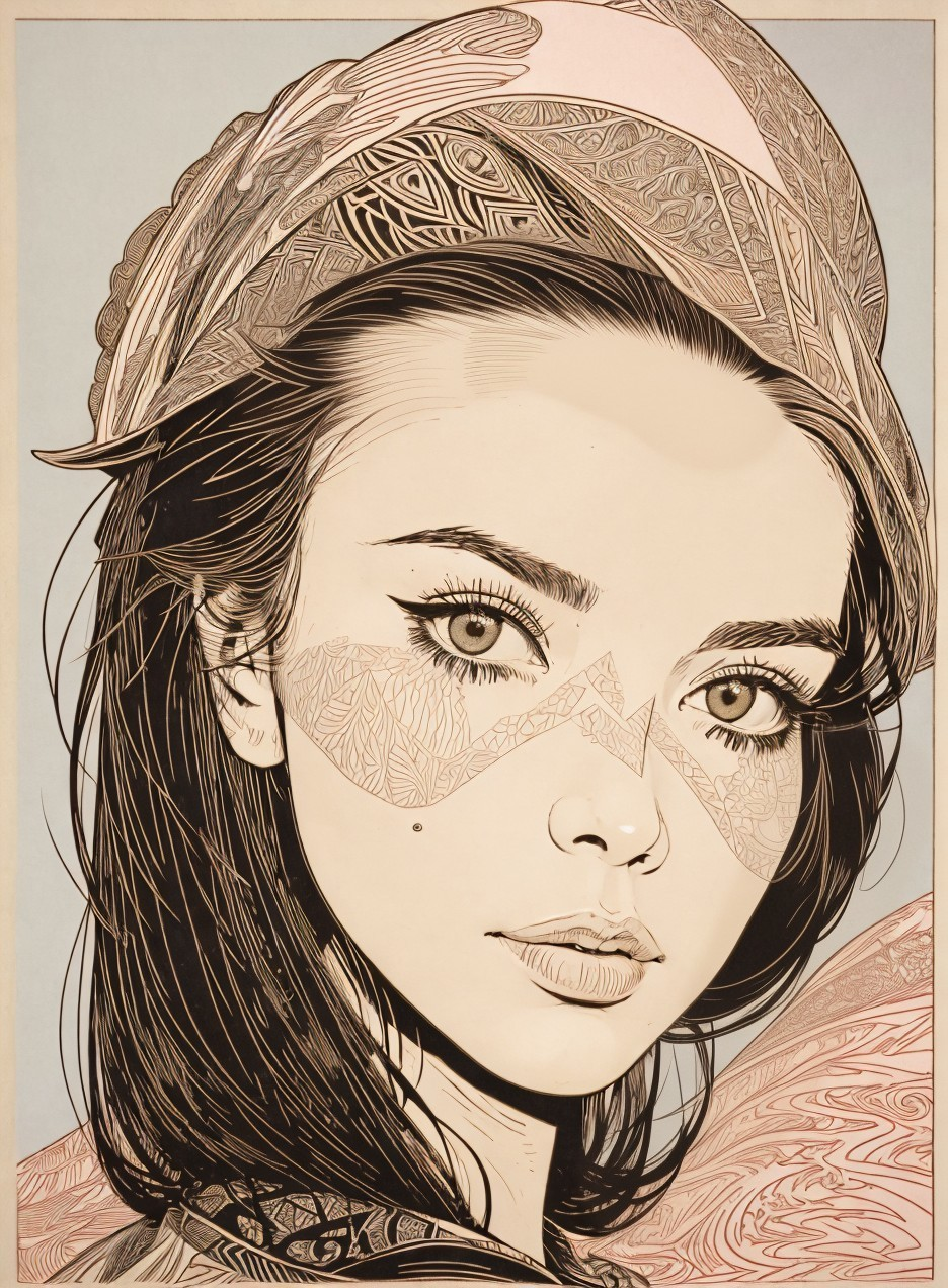 Woodblock print, tints of 3d linocut, upper body portrait of beautiful temptress, wide-angle perspective, hues, (stacked lines, (triadic color scheme ochre beige black, zentangle style), stylized lineage, perfect handsface, cel-shaded, 7:5)), tints of bob Eggleton, tints of instaport style, layered geometrical vector art, detailed style of Edward Hopper and Geof Darrow, intricate lineage, tints of geometrical art, 3d effects 1.4, dynamic lighting, anisotropic filtering, brightness 1.4, strict textures, stylized illustration 1.8, vaporous flares, stacked strokes, radiance, ((chaotic background, 3d effects), vector 9:7, radiance, brightness 1.4), spiritual essence, intricate background, detailed eyes, tints of Streamline_Moderne, stacked lines, soft edges,stylized lineage, Schreger lines, Pastel colors 1.7, embossed strokes, raytraced shadows1.8, vibrant colors, high coloring 1.9, shadow mapping 1.3, octane render, quaint, quilling, synthetic, synthetic, Auracore 1.9, grunge 1.7, high coloring 1.9, depth of field 1.7, tints of book cover art, tints of marvel comic book art, dreamy, soft edges, intricate lineage, beautiful composition 1.9, brightness 1.9, brushed textures 1.7, wavery texture patchwork 1.8, grunge, scruffy