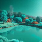 A surreal landscape features undulating, colorful hills covered in vibrant textures, surrounded by a calm body of water reflecting a starry sky and distant celestial bodies.
