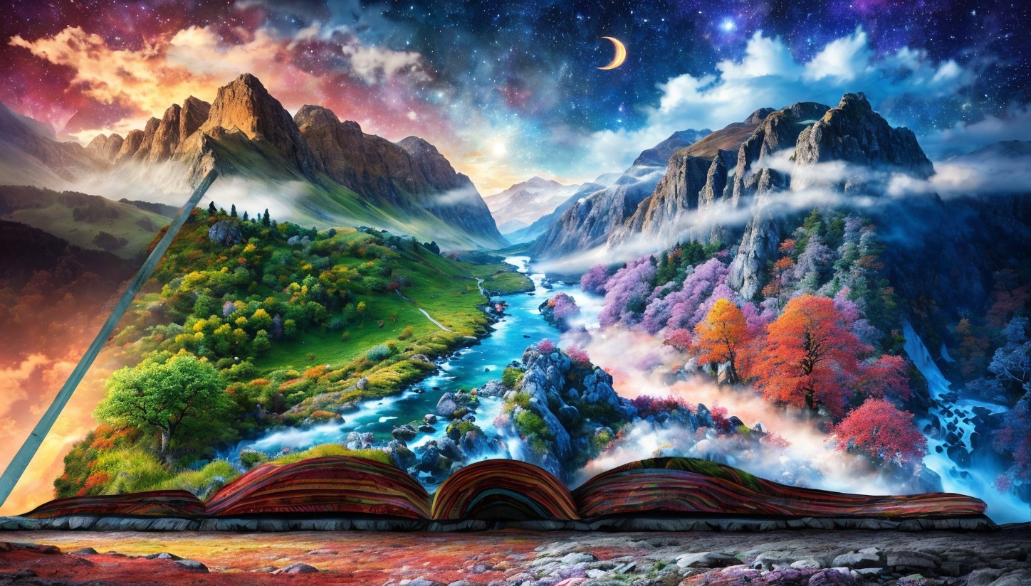 A vibrant, surrealist landscape flows from an open book, blending day and night, with colorful trees, mountains, and a river.