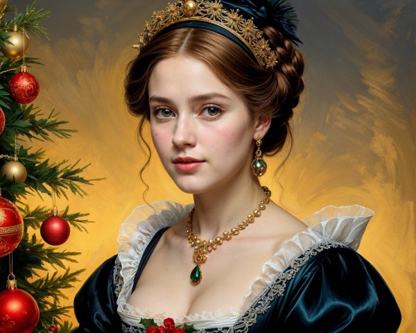 A regal woman with a tiara and jewels, in a lavish gold-trimmed room, exuding elegance and nobility.
