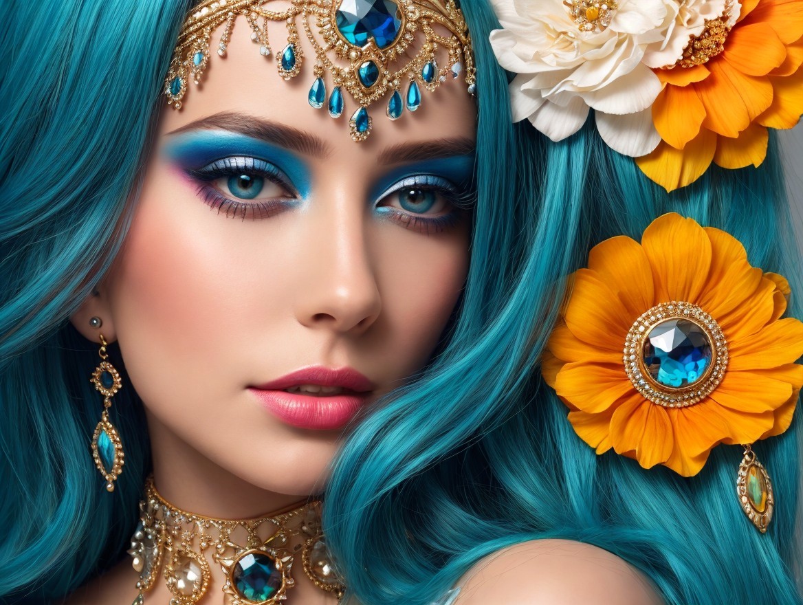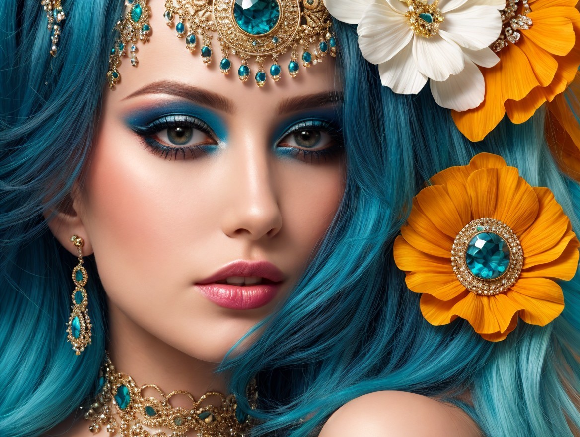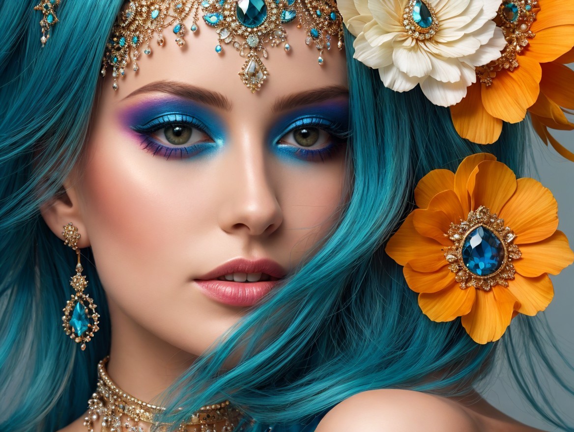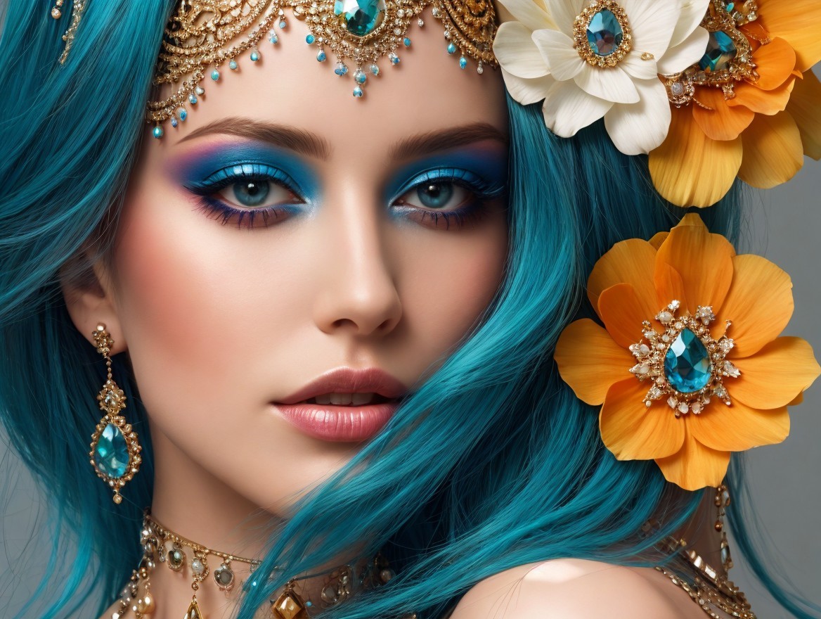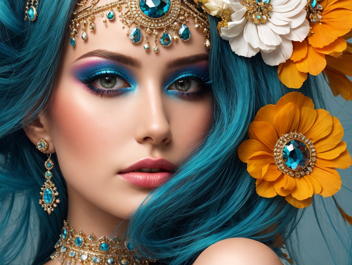 A close-up portrait of a woman with vibrant blue hair adorned with colorful flowers. Her striking makeup features bold turquoise eyeshadow, complemented by elegant jewelry and a captivating expression.