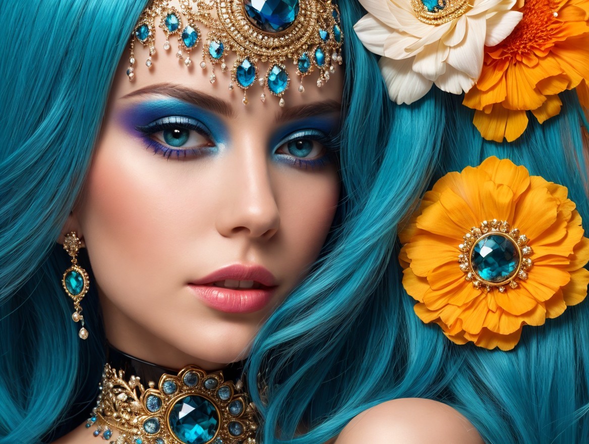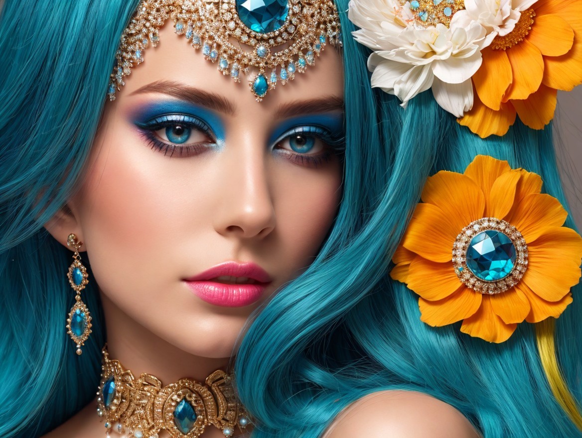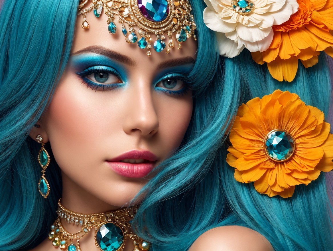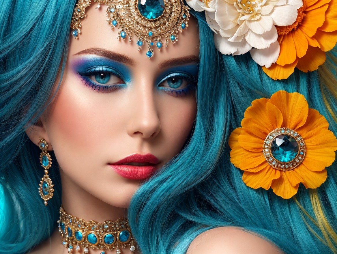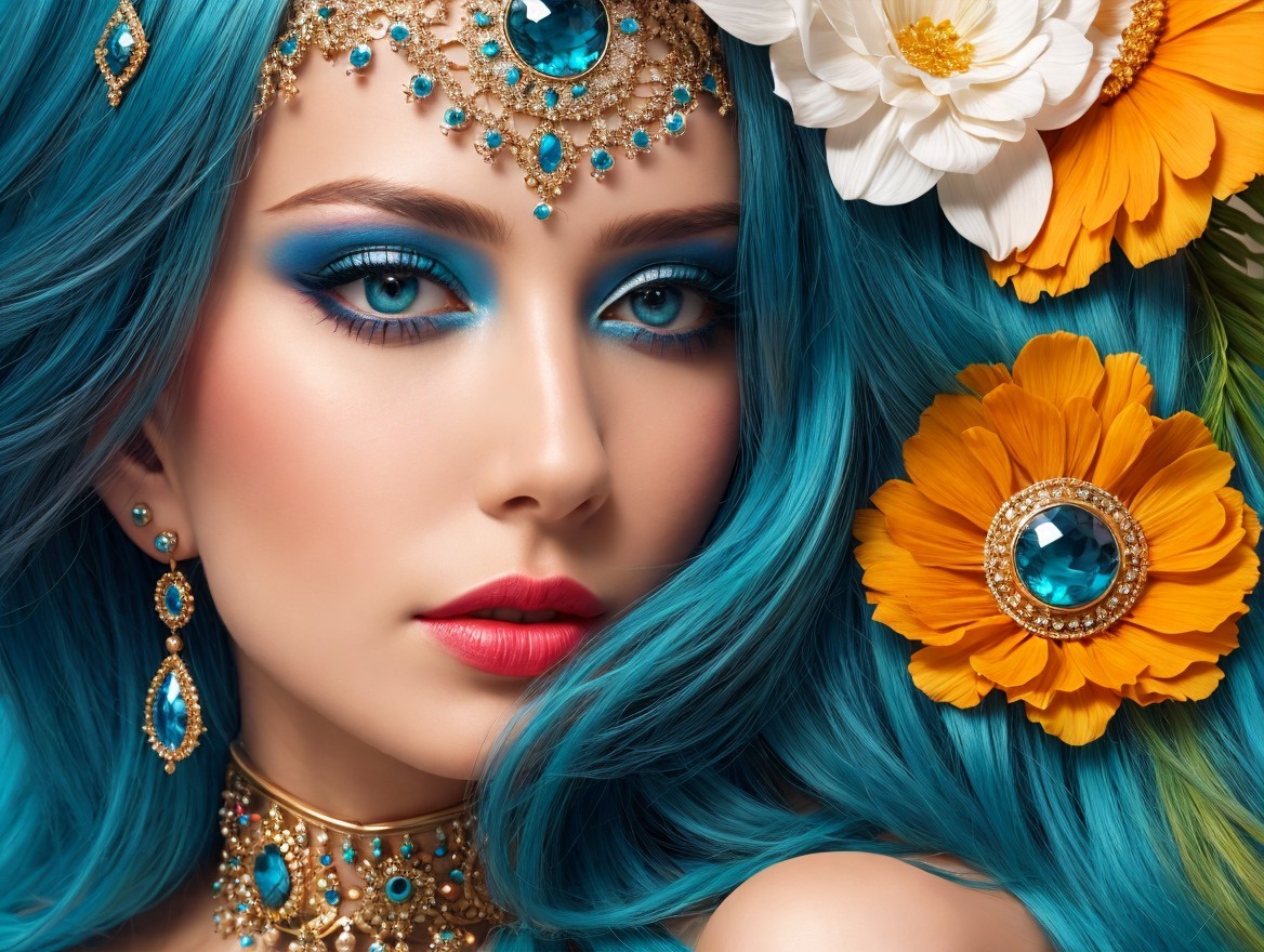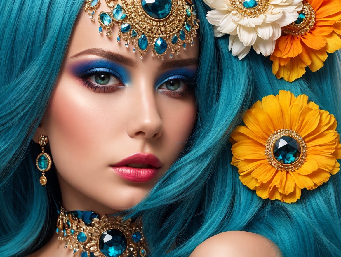A close-up portrait of a woman with vibrant blue hair adorned with colorful flowers. Her striking makeup features bold turquoise eyeshadow, complemented by elegant jewelry and a captivating expression.