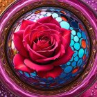 A vibrant purple and orange rose sits at the center of a circular frame, accented by a delicate butterfly. The background features a gradient of blue, enhancing the flower's rich colors.