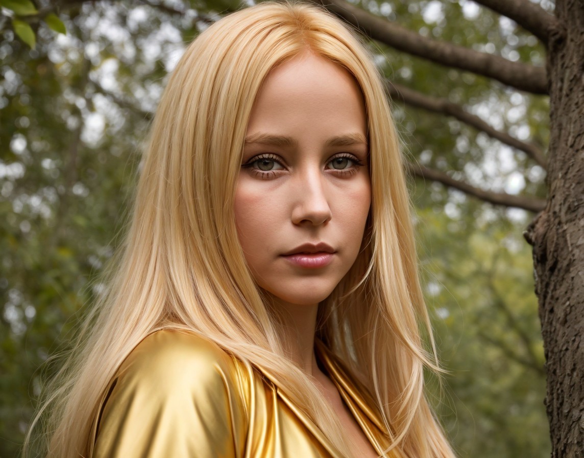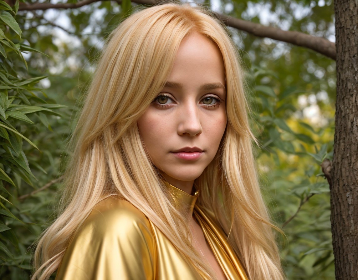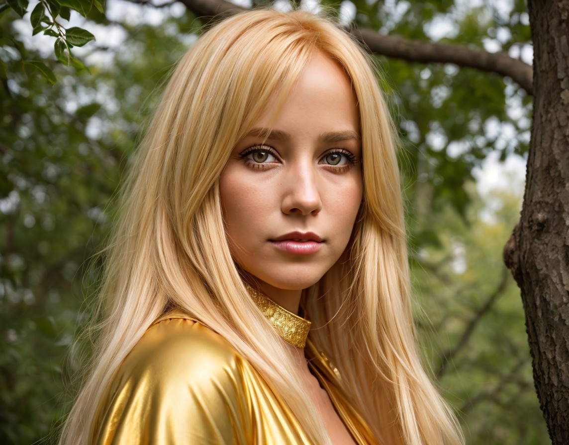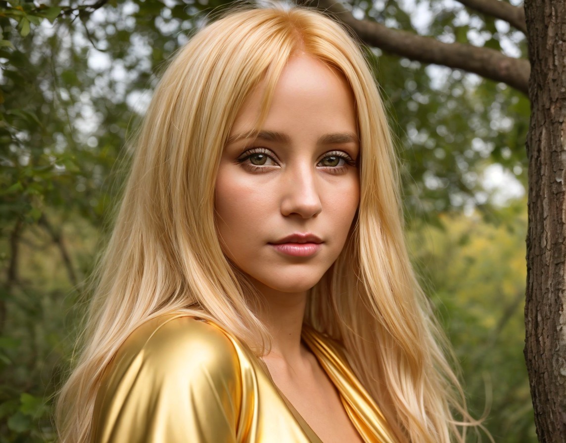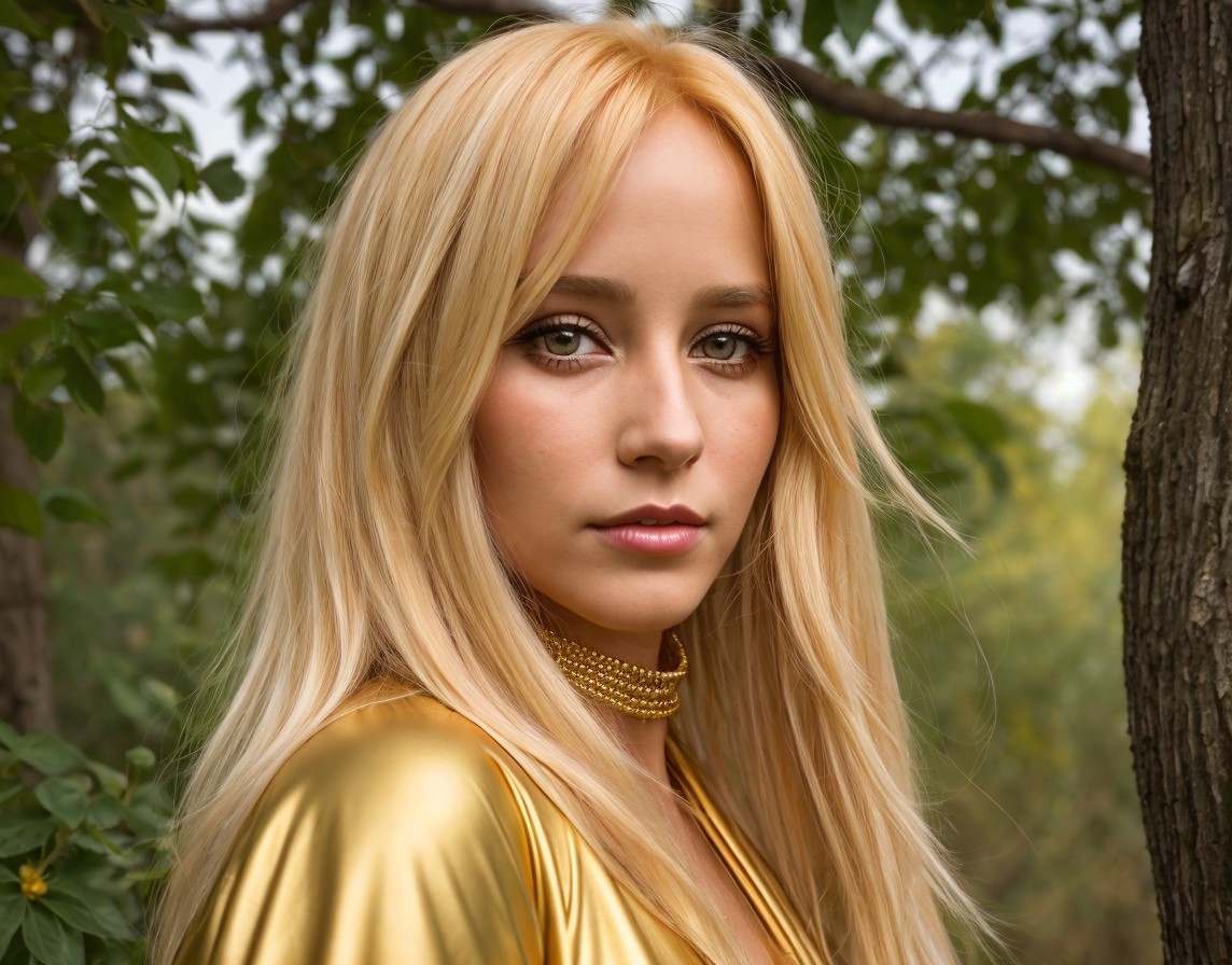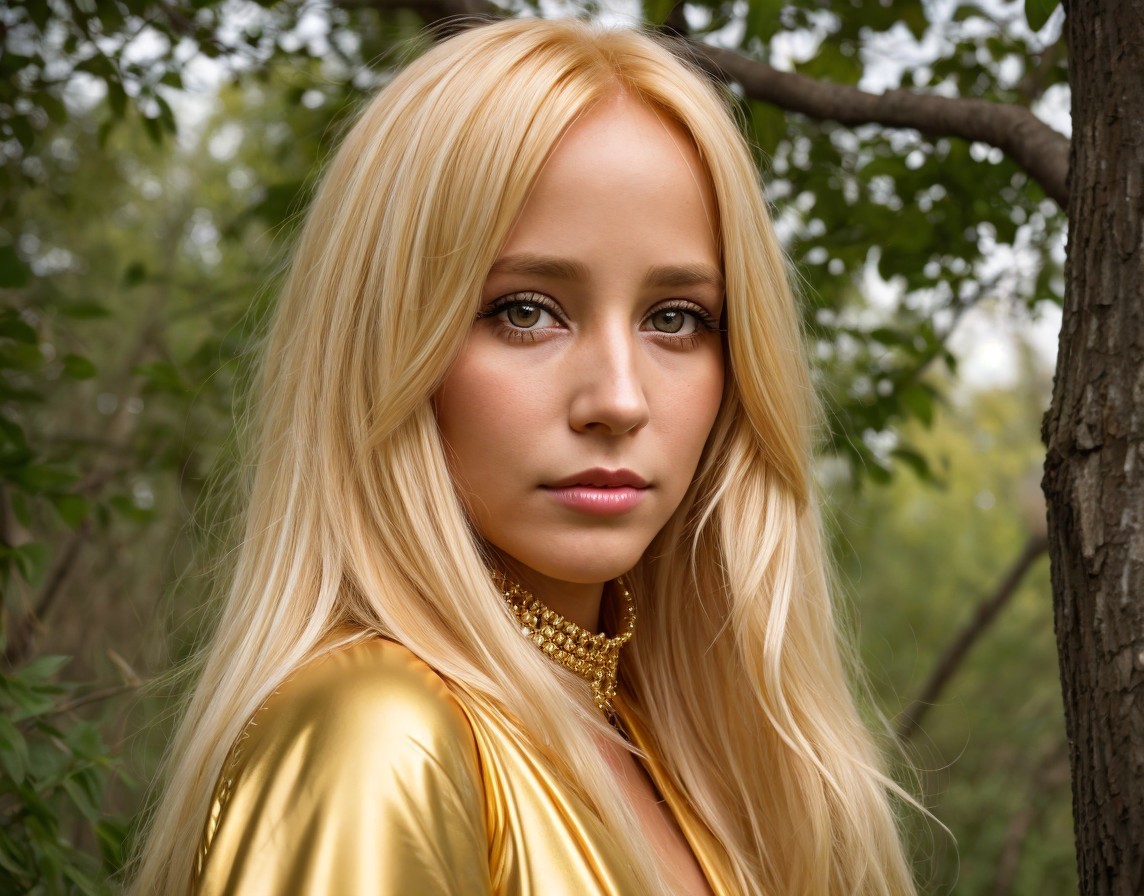 A woman with blonde hair posing in a golden outfit, with trees in the background.