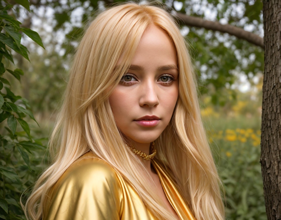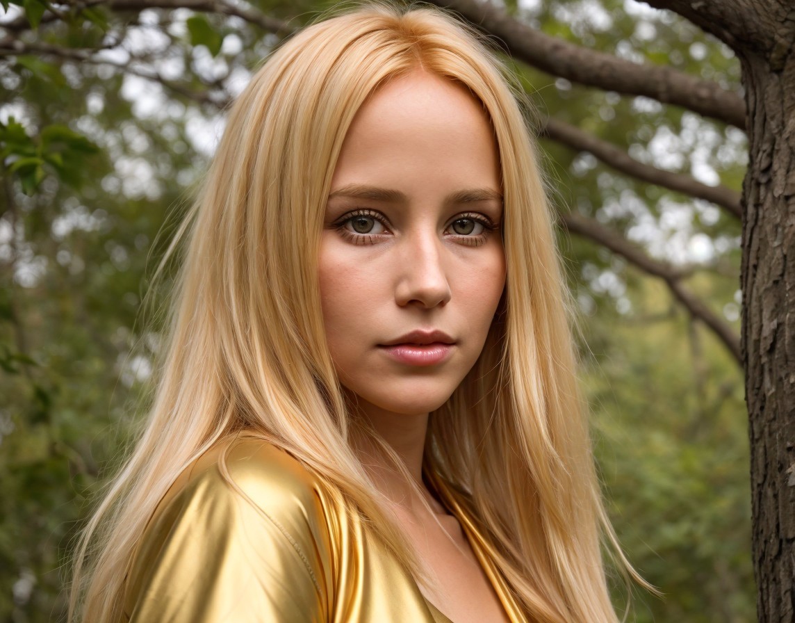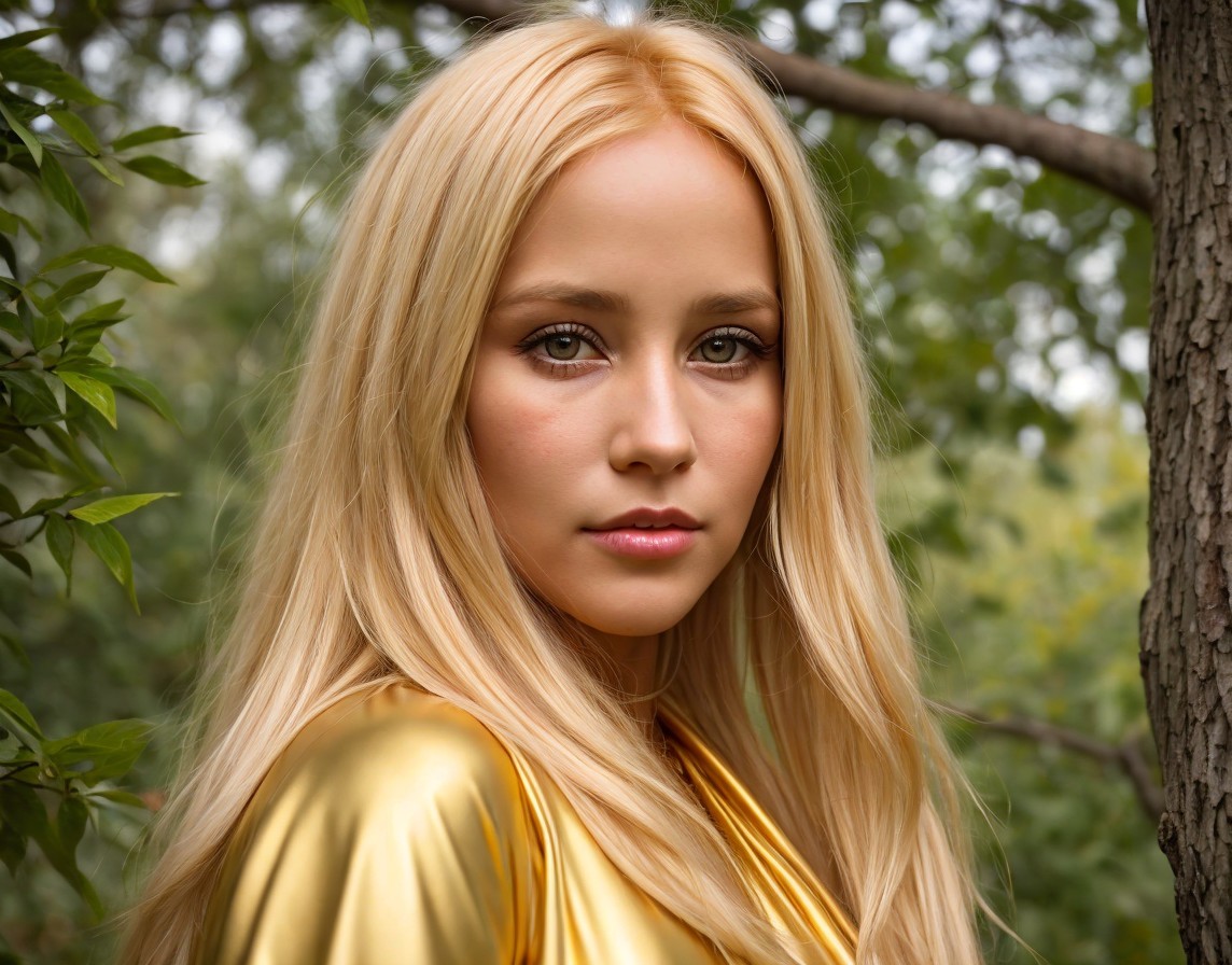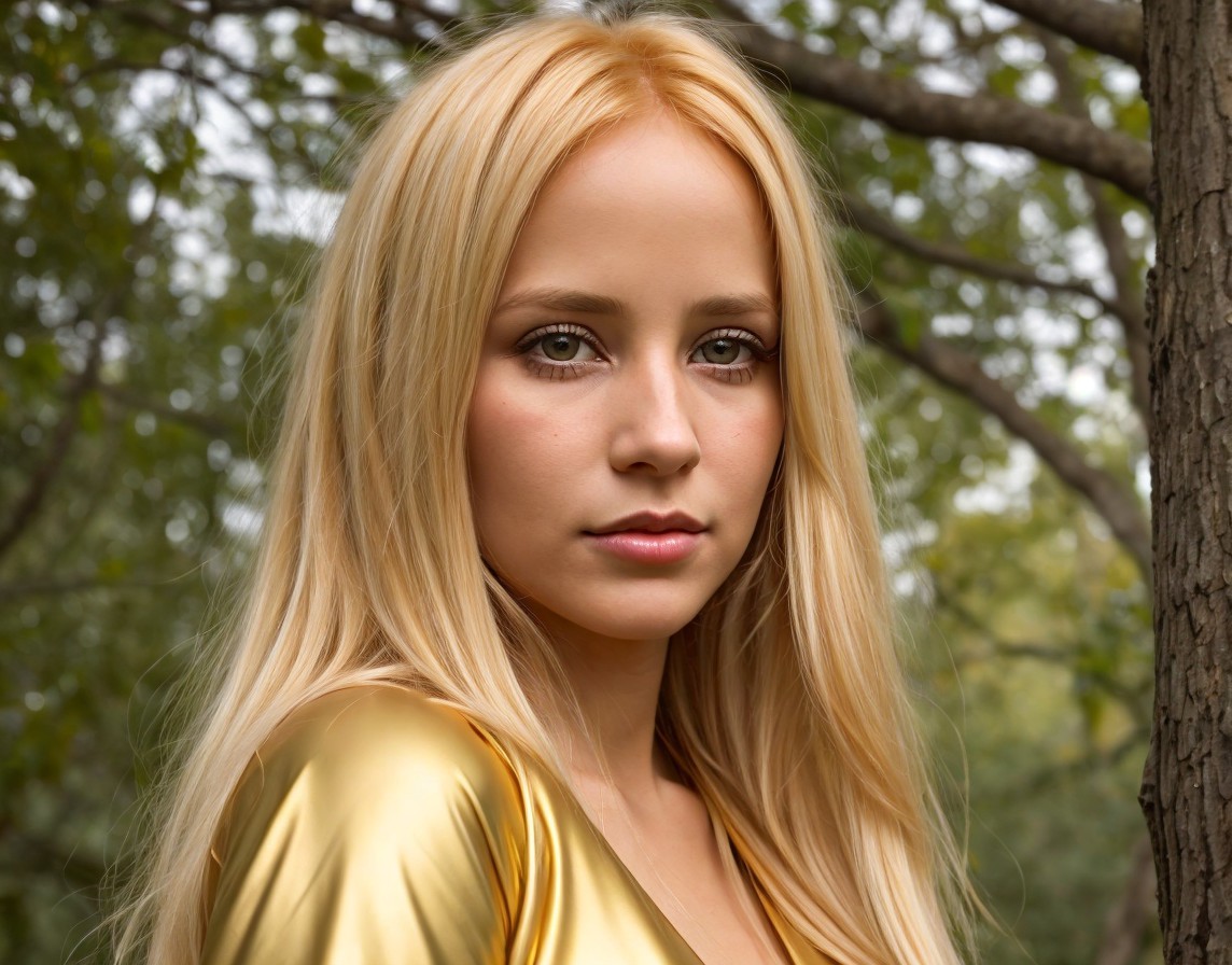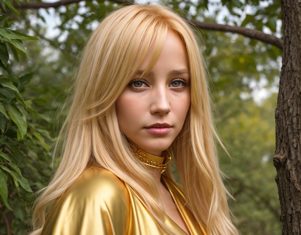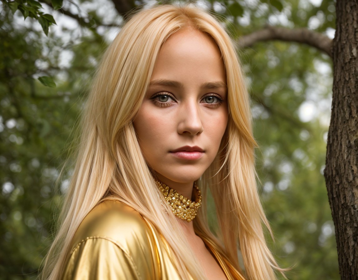 A woman with blonde hair posing in a golden outfit, with trees in the background.
