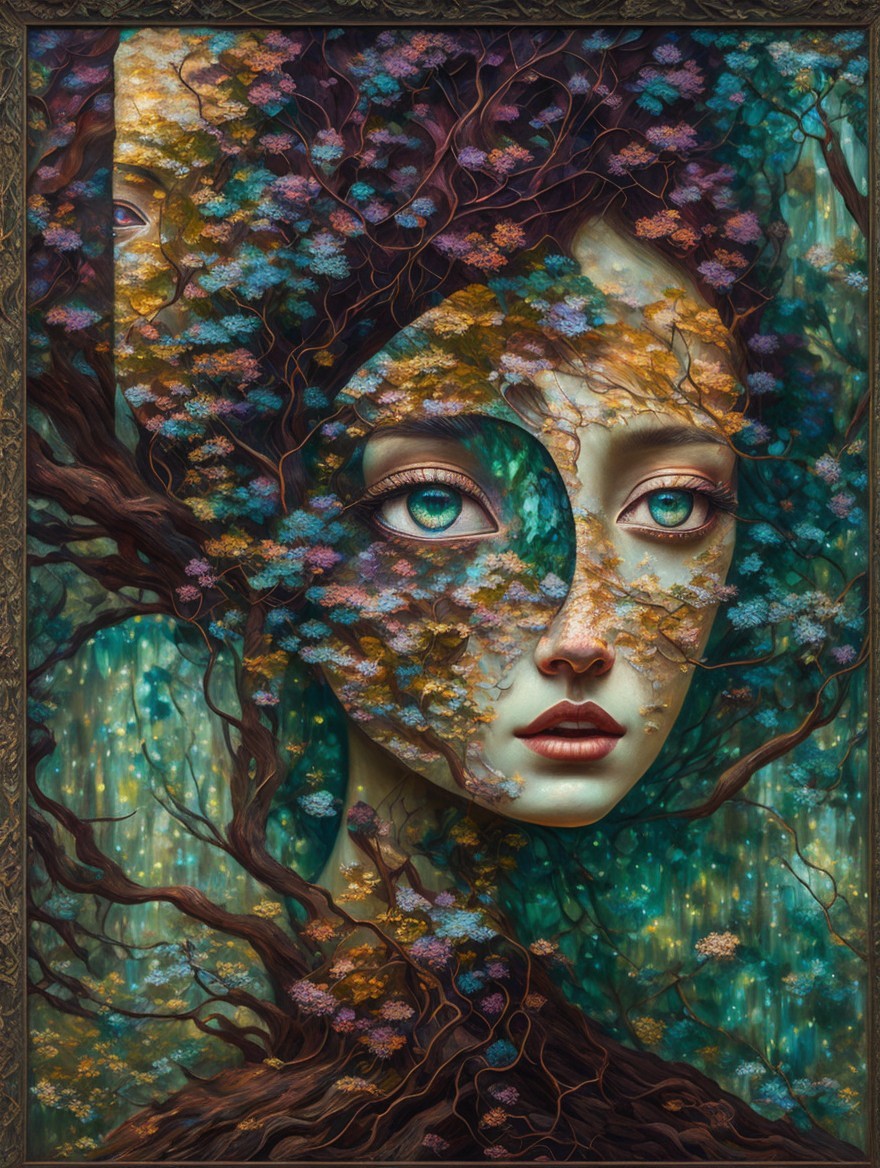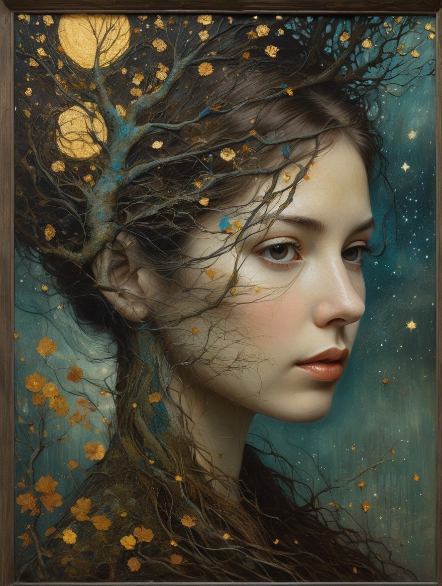 Female portrait painting in profile, pasty tempera on old worn canvas, beautiful mind journey. By Christoffer Relander, Dan Mountford, Van Gogh, Yossi Kotler, Klimt, Victo Ngai, Naoto Hattori. Amazing multiple exposure optical illusion, mixed media, surrealism, otherworldly. Impressive old trees, vines, roots, starry night sky, mountains, rivers, in the clouds, storybook illustration, by Susanne, landscape portrait, perfect face, enigmatic, dreamlike, beautiful lighting, beautiful vibrant colors, ultra detailed seamless blending of two scenes.