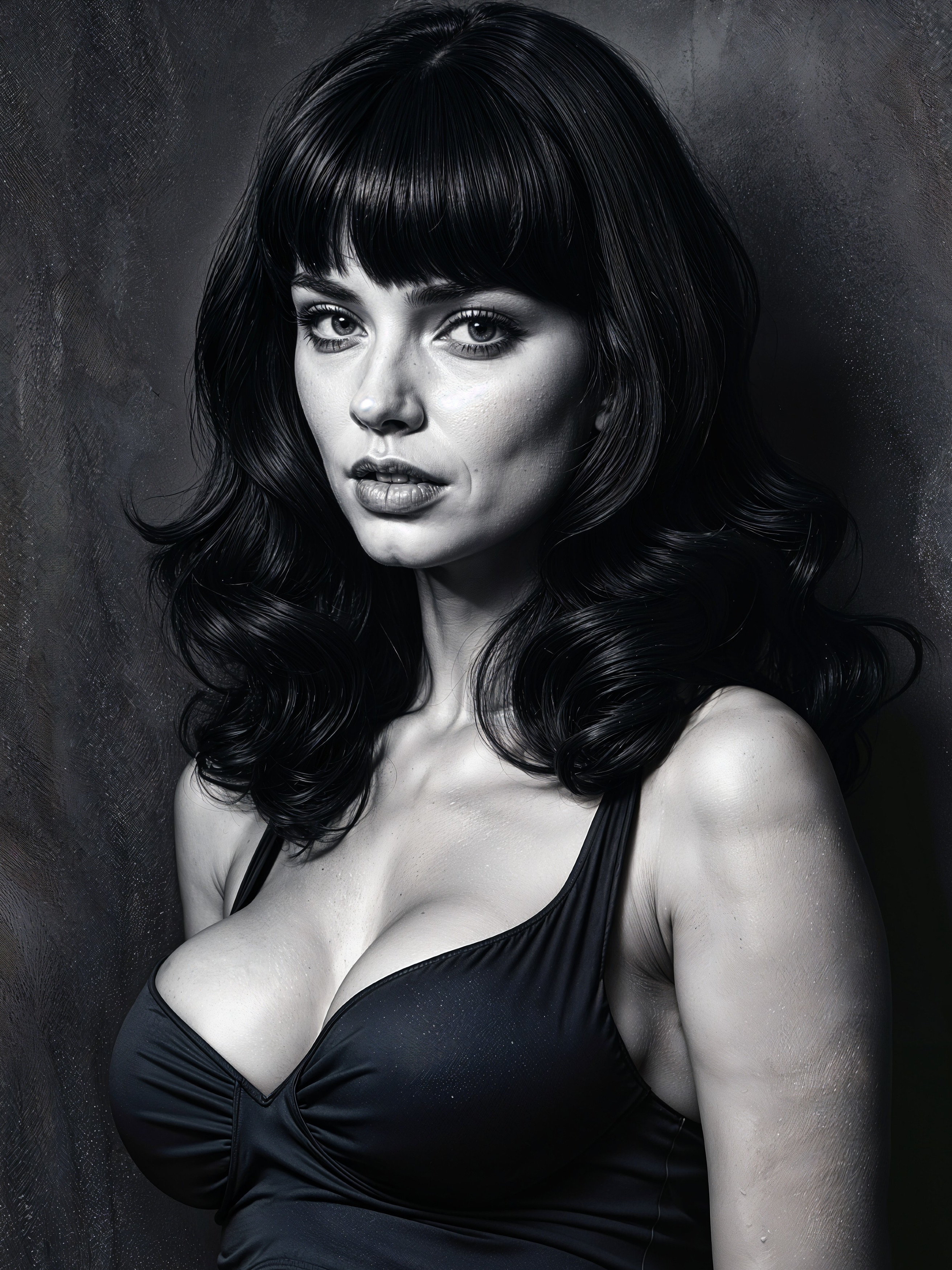 A black-and-white portrait features a woman with long, wavy hair and a confident expression, dressed in a stylish black top, highlighting her striking features and elegance.