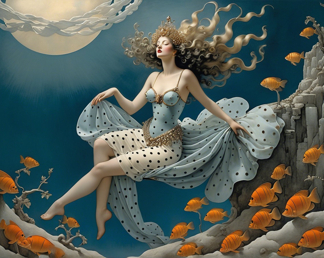 Prompt: A woman adorned in spots. Surreal dream in the style of Michael parkes. Whimsy of catrin wells stein , nostalgia, glory, Mercury Glass patina, light and gossamer haze, moody, Art Brut, moody, somber, desaturated colors. In the style of John Rogers cox . This artwork amalgamates the artistic styles of Michael Parkes,
