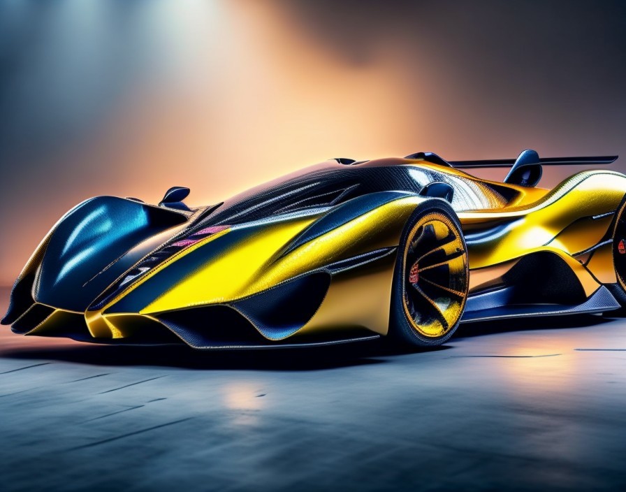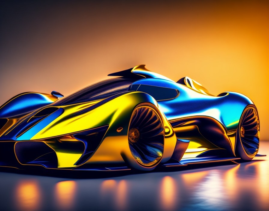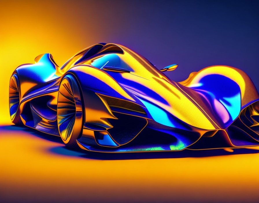A futuristic, sleek blue and gold car with dynamic curves, set against a vibrant purple and orange neon-lit background.