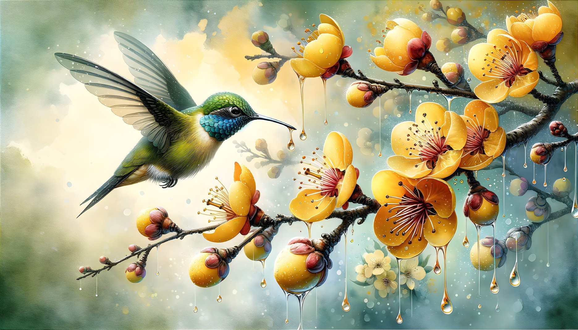 A close-up of a green hummingbird beside a yellow apricot flower captures the whimsical movement of nature.