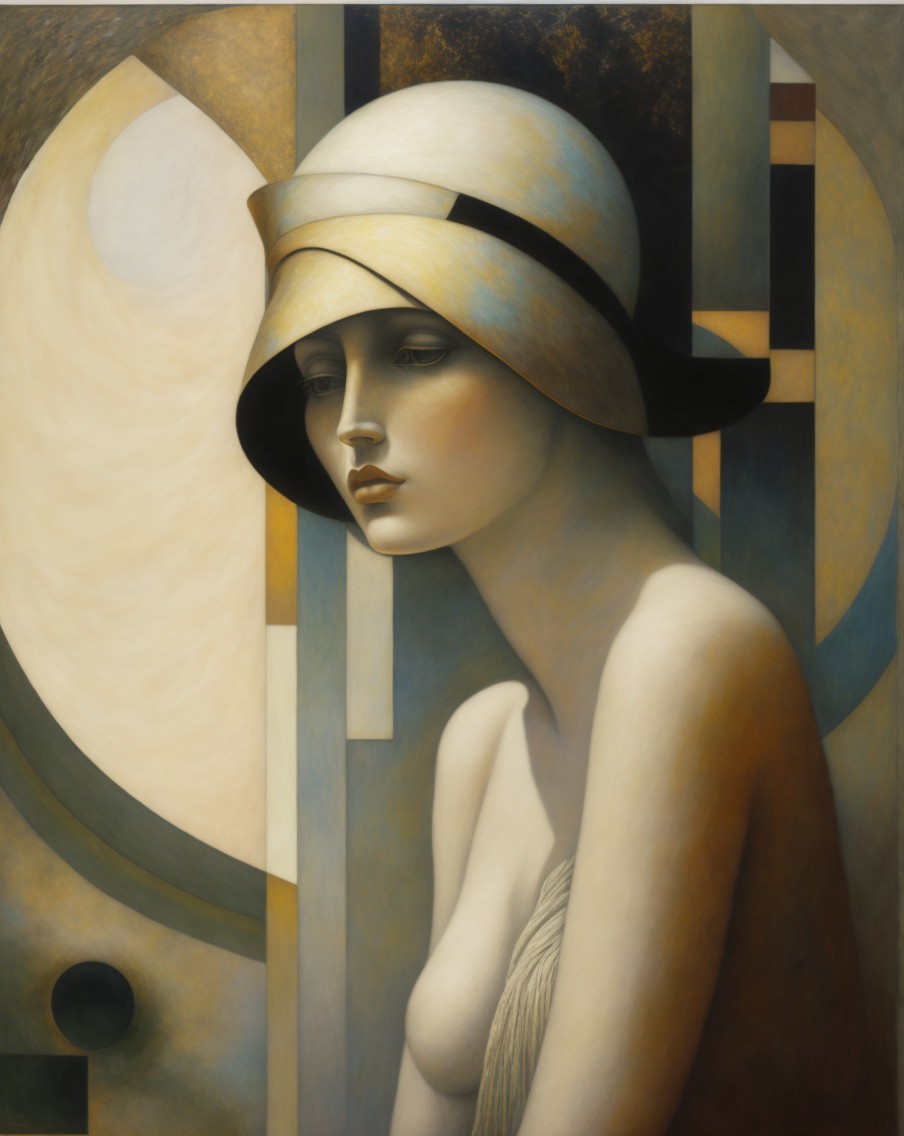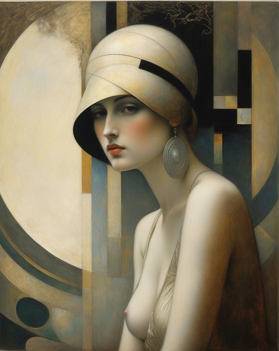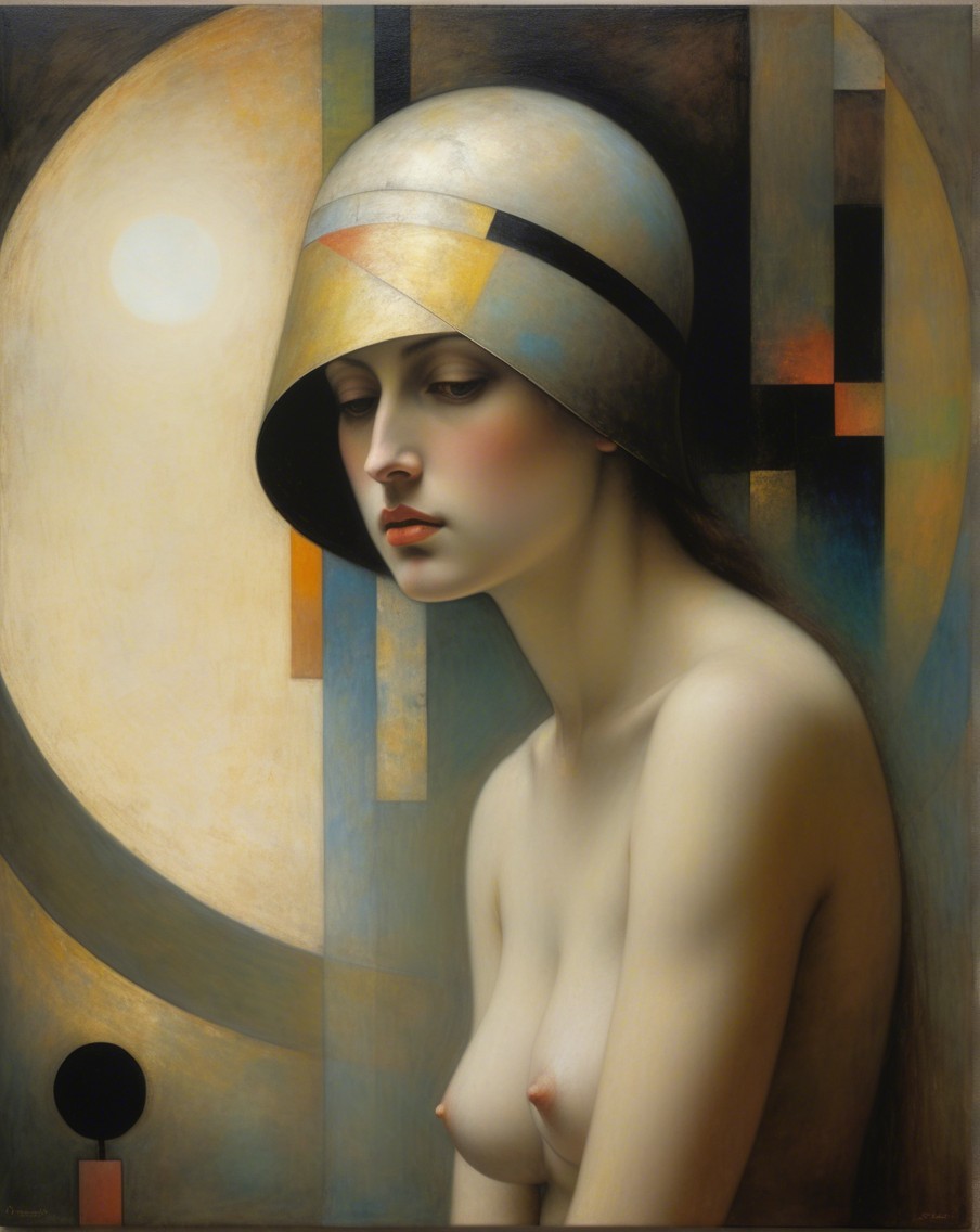 The artwork features a contemplative woman in a metallic helmet, wearing a sparkling top. A shadowy figure stands nearby, with a large, glowing circle in the background, evoking a sense of mystery.