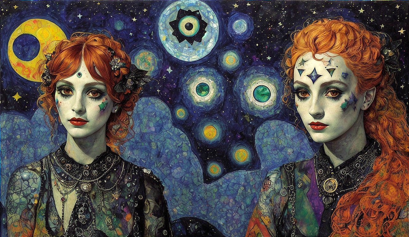 Two women with cosmic makeup and red hair, set against a starry background featuring celestial bodies and symbols.