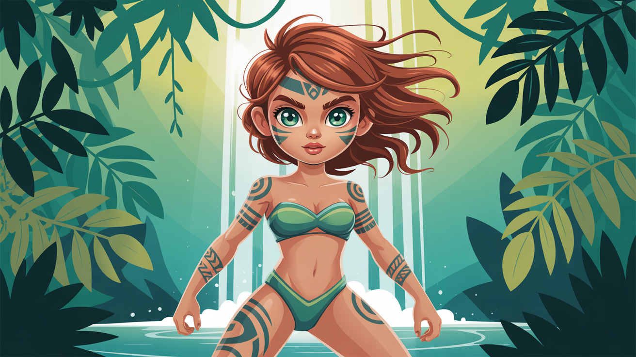 A charming anime-inspired warrior girl showcases her strength and grace in a strapless swimsuit, blending fierce determination with playful charm. Her confident pose and vibrant colors capture attention.