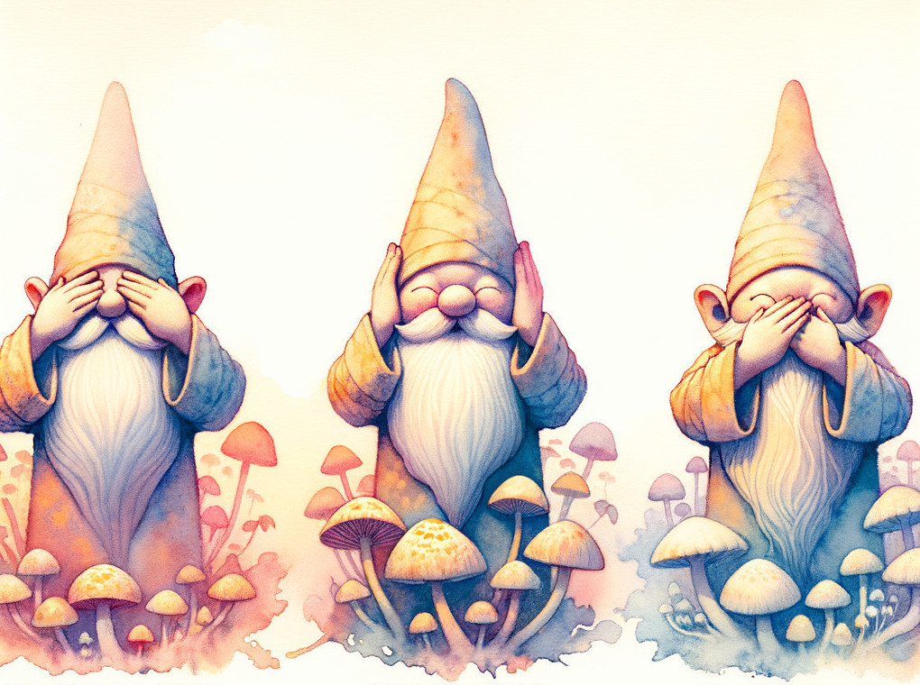 Three whimsical gnomes in a "see no evil, hear no evil, speak no evil" pose, surrounded by colorful mushrooms.