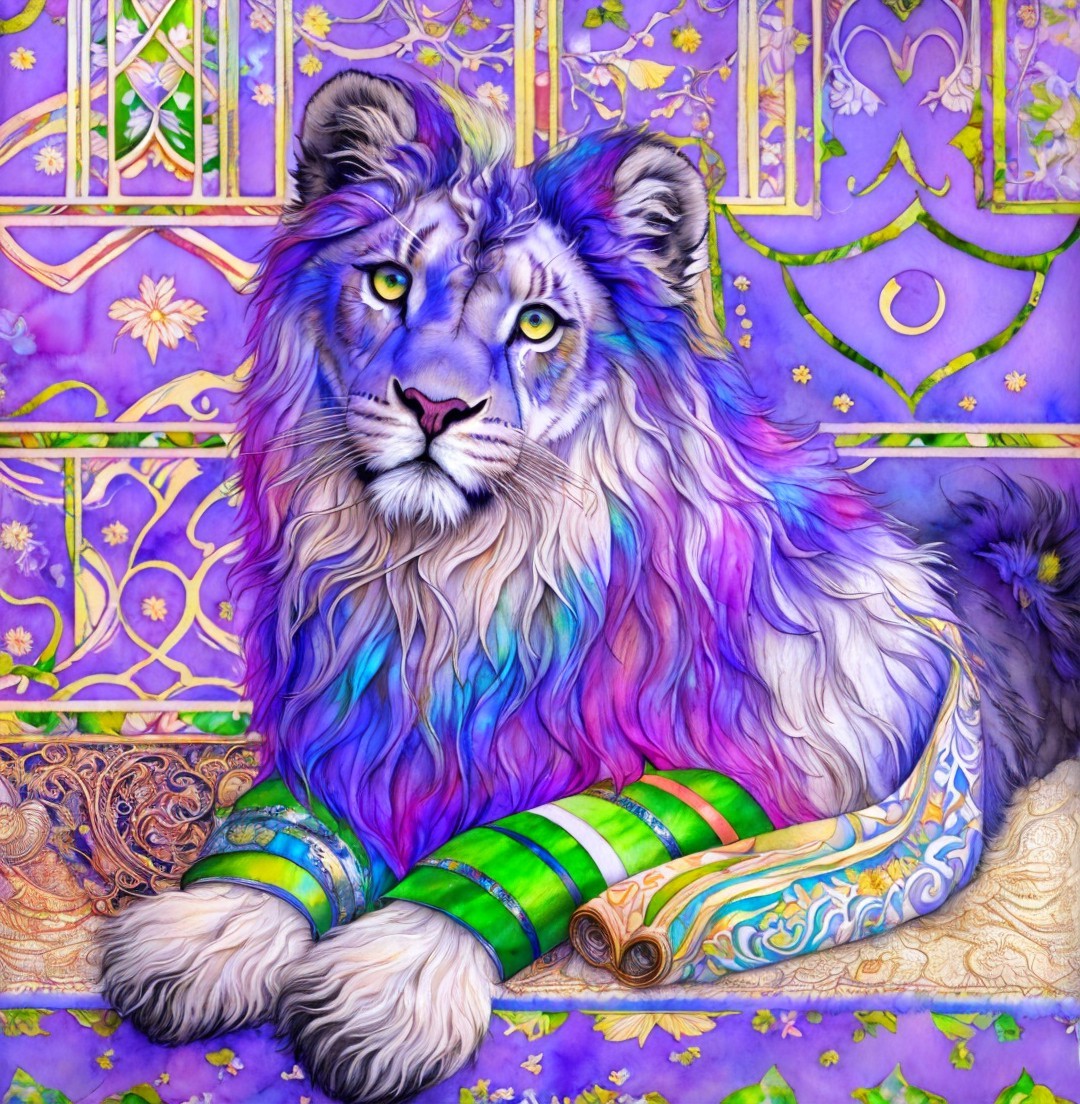 A colorful, illustrated lion with vibrant mane shades of blue and purple lying regally with a cub against a detailed purple background.