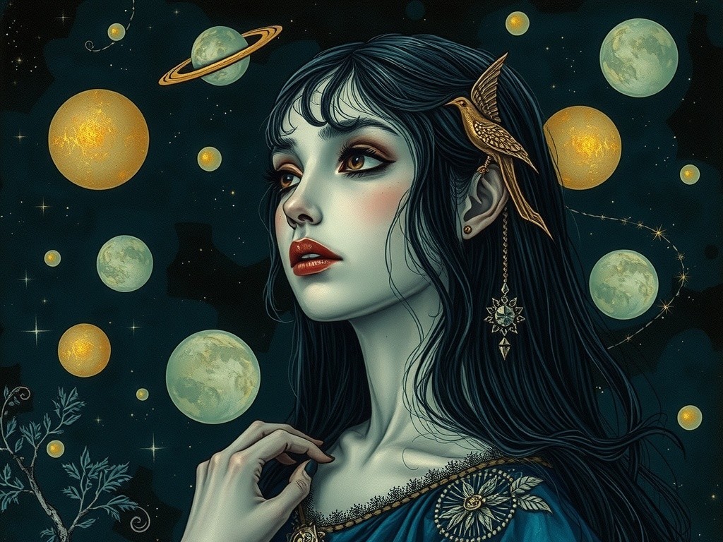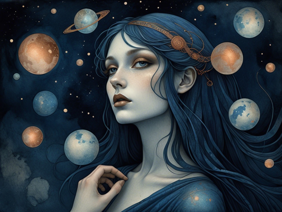 A surreal artwork of a woman with blue skin, flowing hair interspersed with celestial orbs, embodying a cosmic theme.