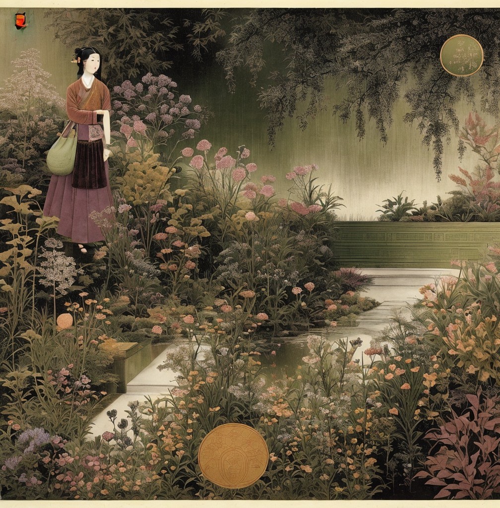 Prompt: Girl in a beautiful garden, 3rd century Chinese miniature art, Velvet blush olive green, sage, lavender, Shabby, Dull Gold, Amber Gray, marbled. dramatic