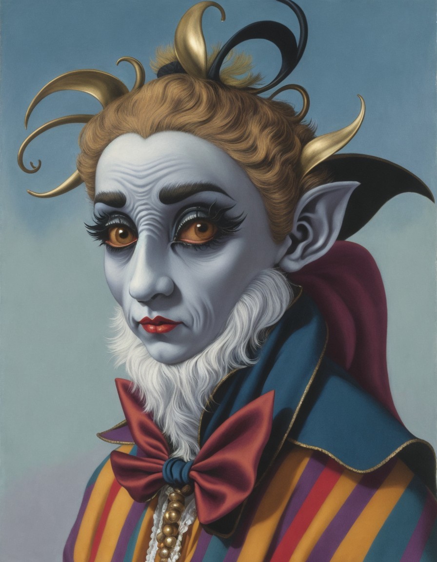 A detailed painting of a whimsical jester with pointed ears, a colorful hat, and a striped outfit, exuding an air of fantasy and nostalgia.