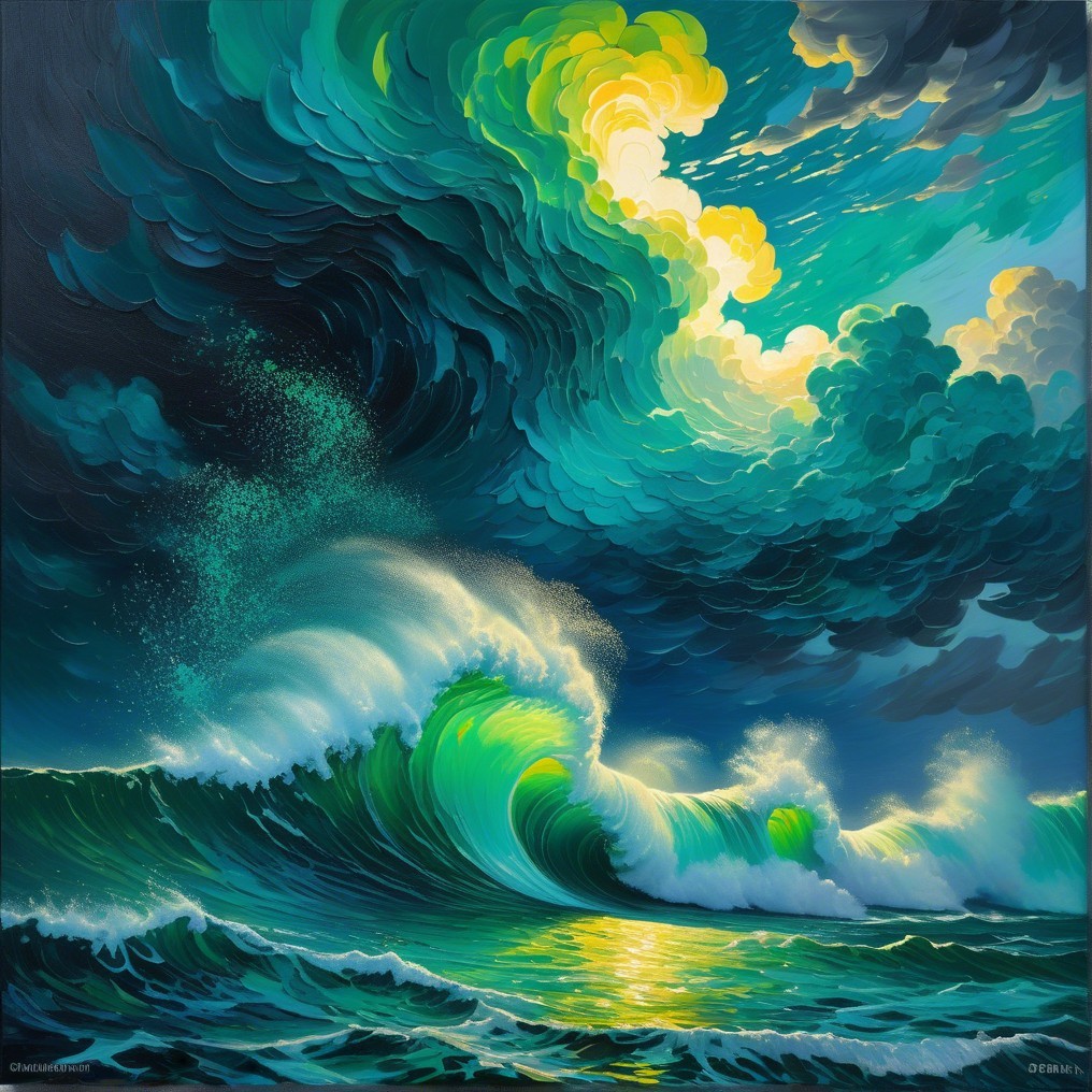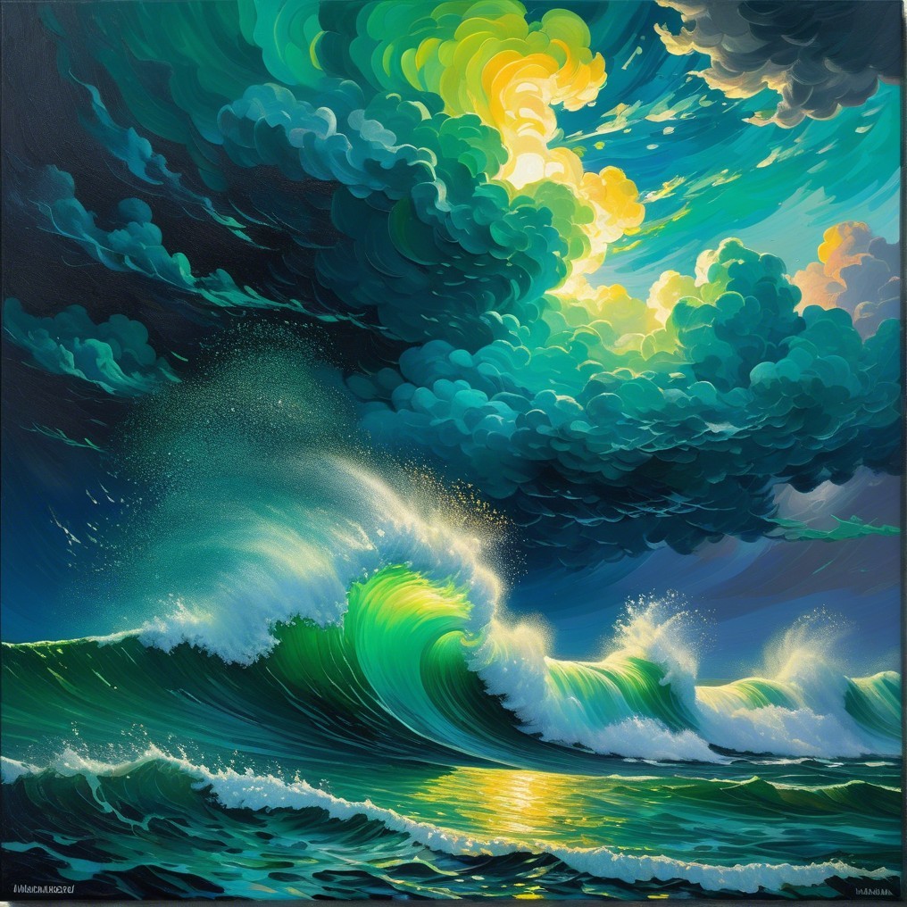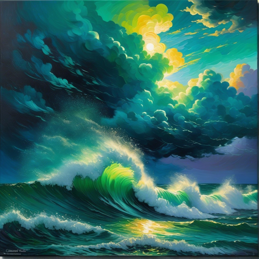 A vibrant seascape features powerful green waves crashing against a dark, stormy sky. Sunlight pierces through clouds, illuminating the ocean with a mesmerizing glow, creating a dramatic, dynamic scene.
