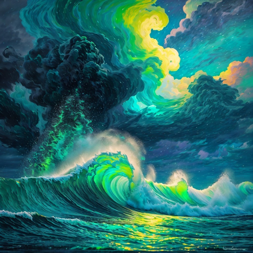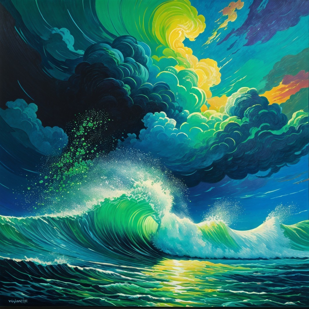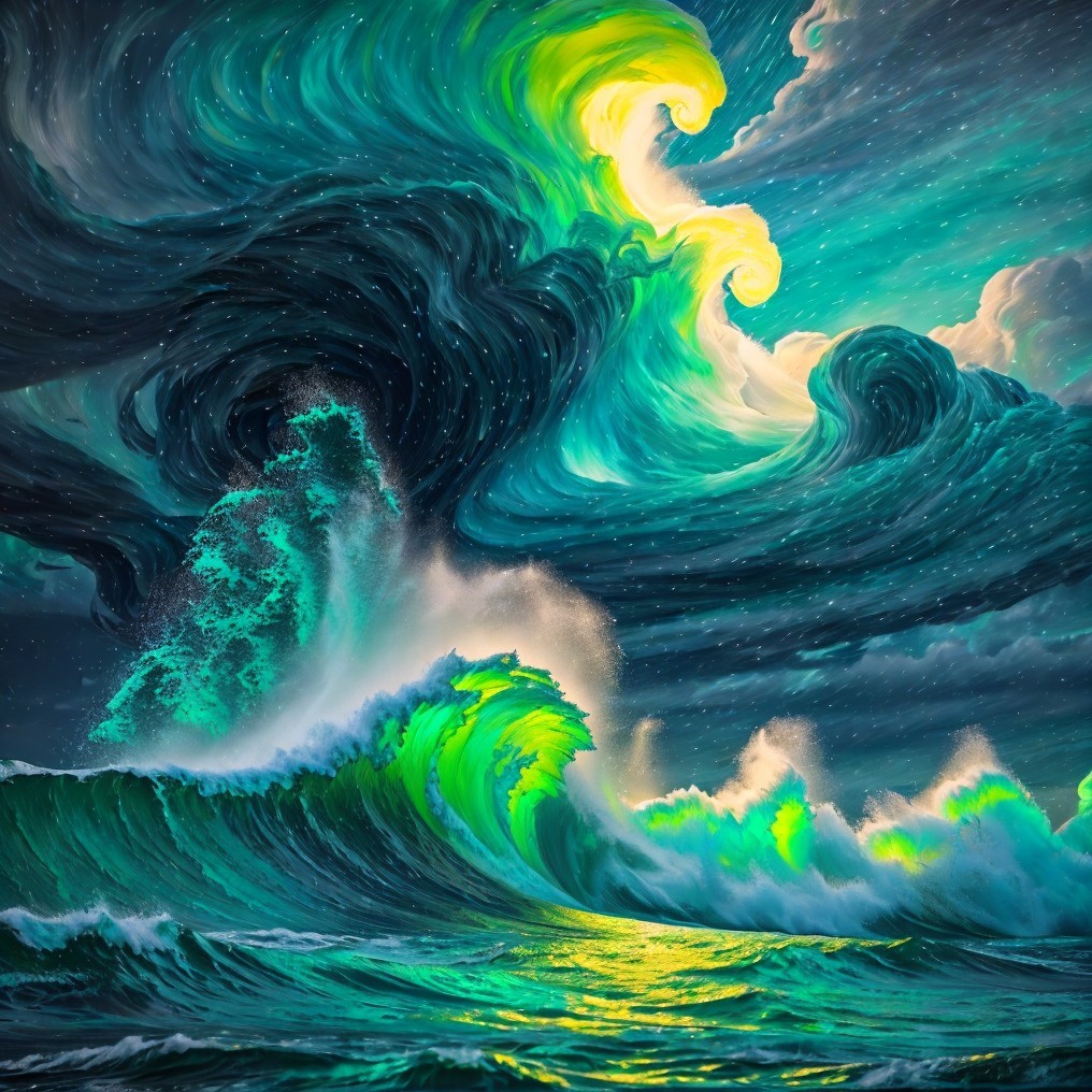 A vibrant seascape features powerful green waves crashing against a dark, stormy sky. Sunlight pierces through clouds, illuminating the ocean with a mesmerizing glow, creating a dramatic, dynamic scene.