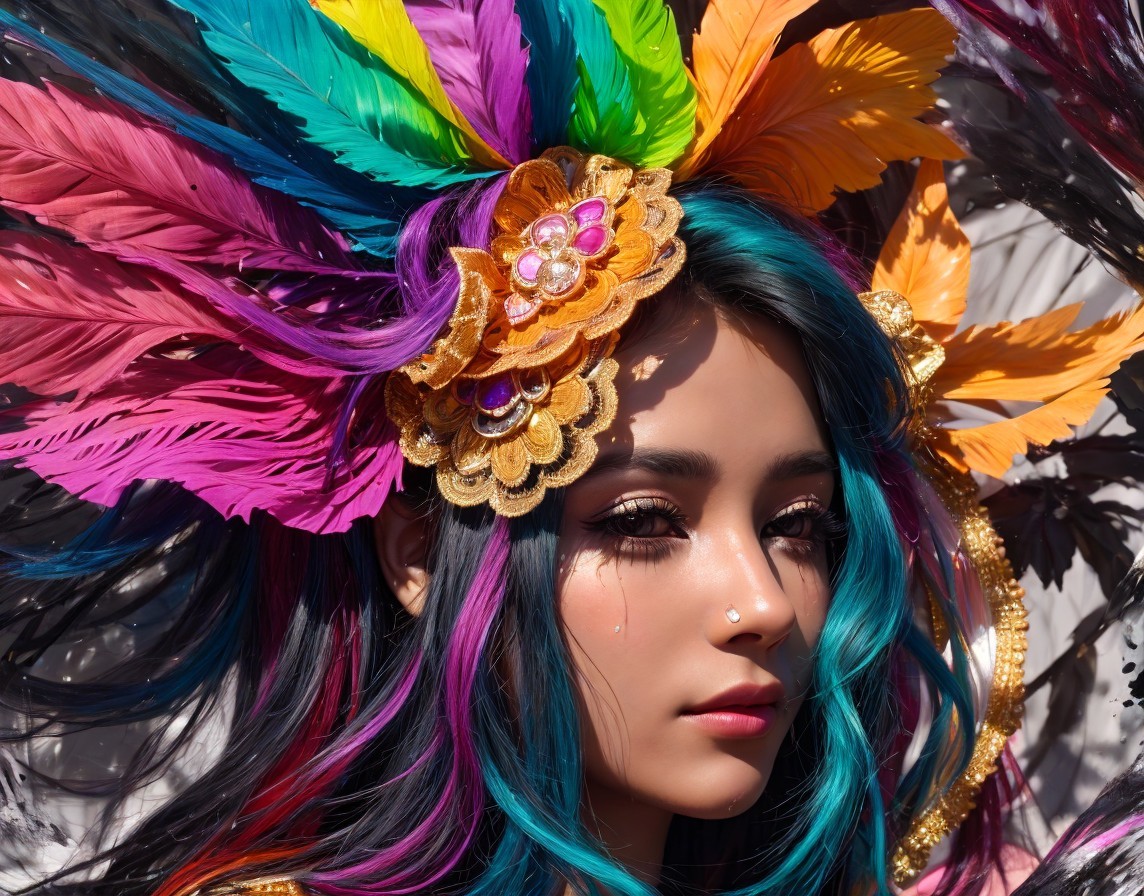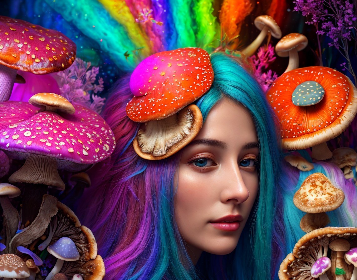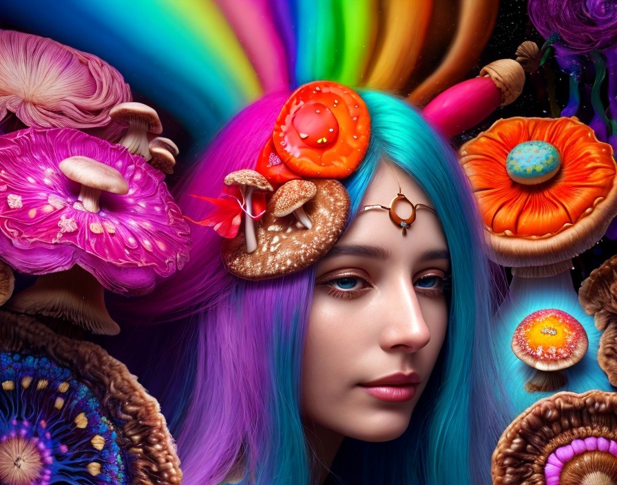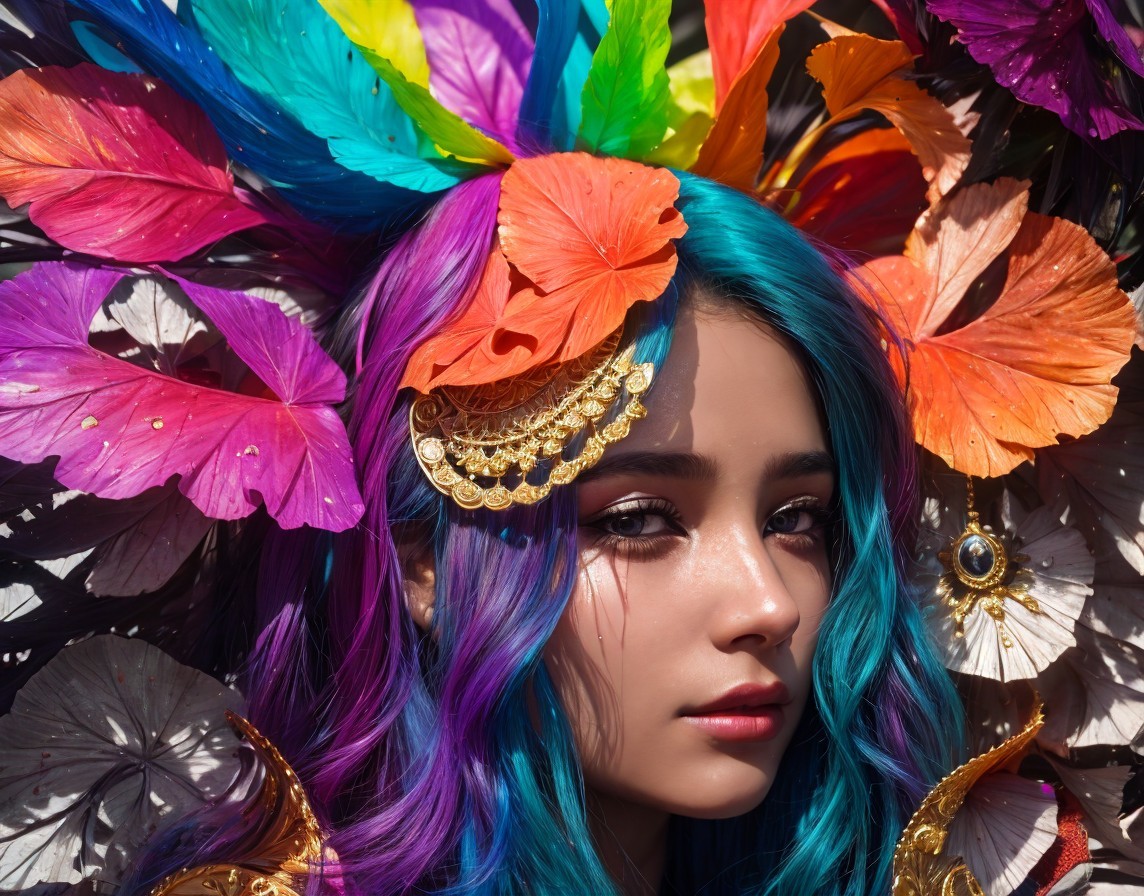 A woman with a colorful, flower-like hairstyle in vibrant rainbow hues, gazes to the side with a soft expression.