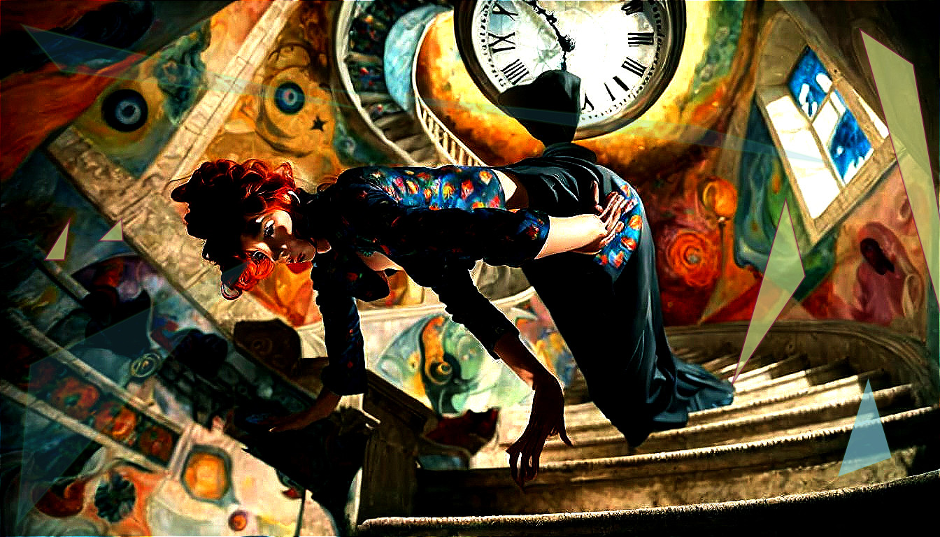A woman in a black dress and hat descends a spiral staircase adorned with vibrant, cosmic murals. A large clock looms overhead, enhancing the surreal, dreamlike atmosphere.