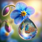 A delicate blue flower with droplets clings to a butterfly reflected within a crystal-clear drop of water, capturing a moment of nature's beauty in soft, enchanting light.
