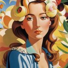 A beautifully painted portrait of a woman in traditional attire, featuring flowing gray hair and soft features. Cherry blossoms and a vivid background enhance the elegant, serene atmosphere.