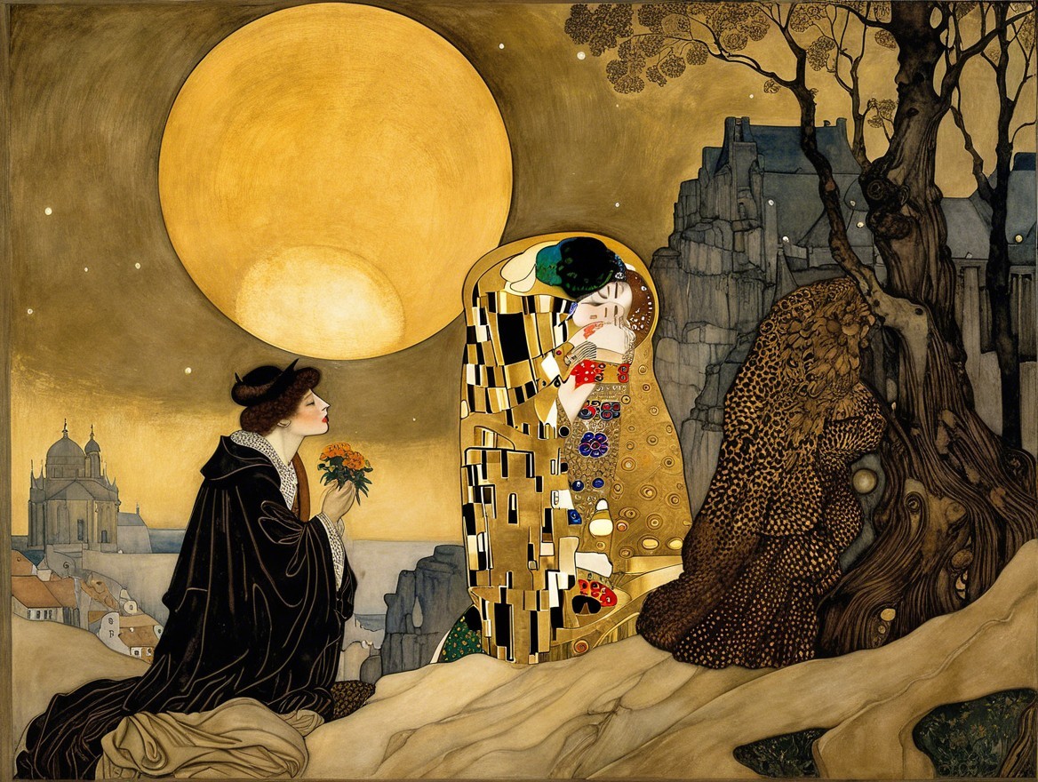 The artwork depicts two women in intimate embrace, sharing a gentle kiss. They are adorned in vibrant gold attire, with soft, romantic expressions and an elegant, warm background.