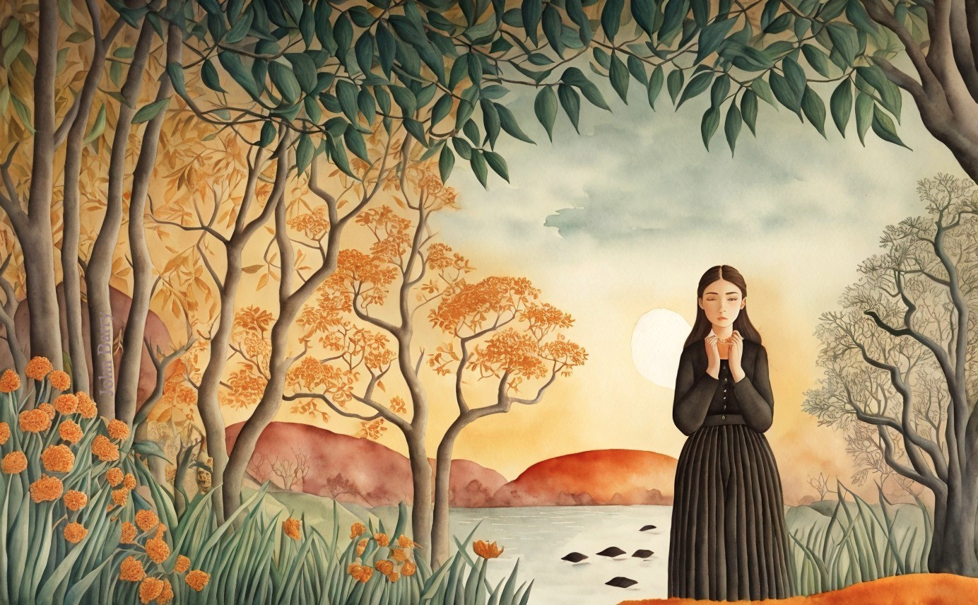 A serene illustration of a woman standing in a contemplative pose amid a stylized, colorful woodland with a setting sun in the background.