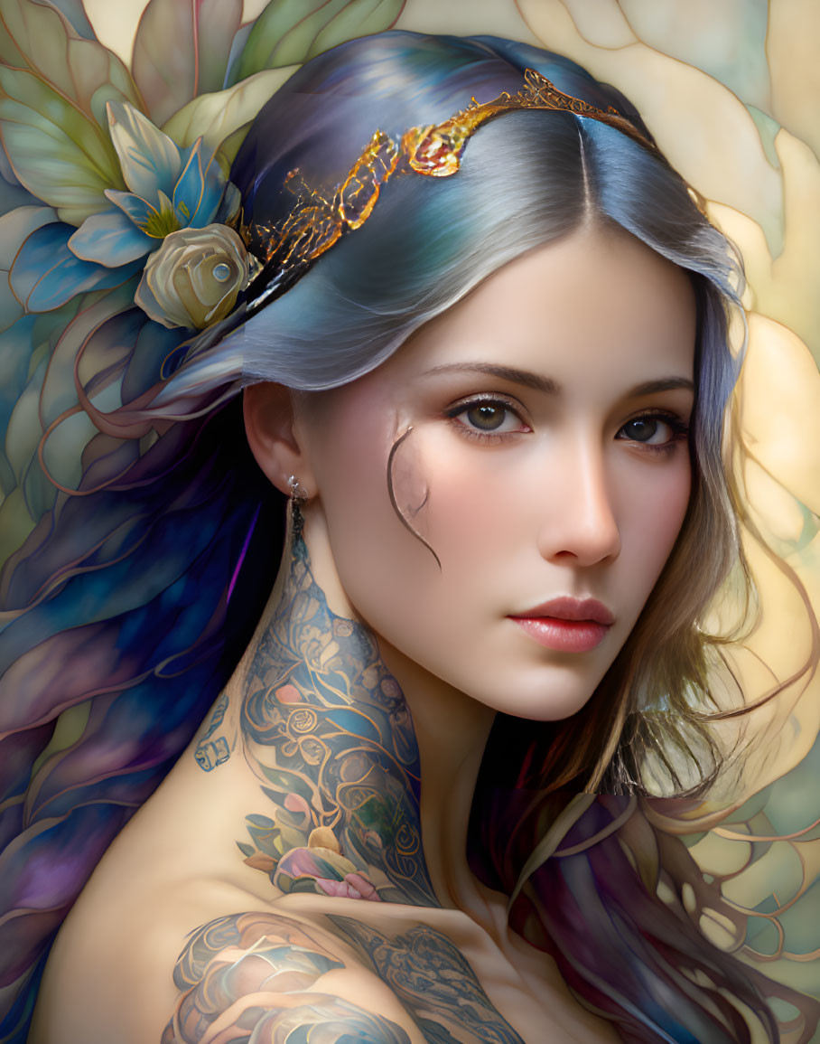 A pale attractive girl with a sexy tattoo on the arm. She is very gorgeous. A concept mixture of water color and acrylic painting by Artgerm and by Alphonse Mucha. Highly detailed and realistic. Portrait view with studio lighting. mixture of cool and warm colors.