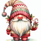 A charming festive gnome in a colorful, patterned sweater and tall hat, holding a small bell and decorated treat. He has a fluffy beard and rosy cheeks, embodying holiday cheer.