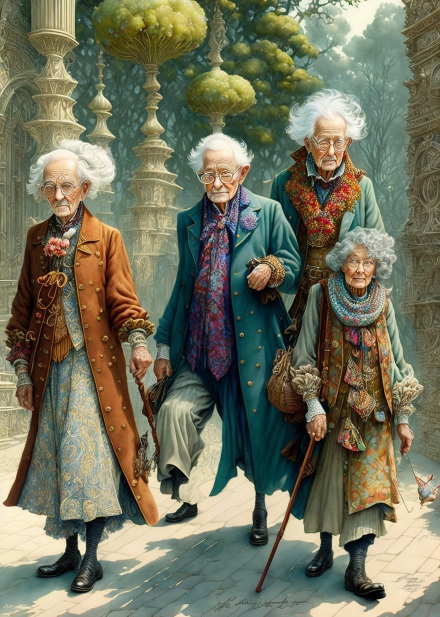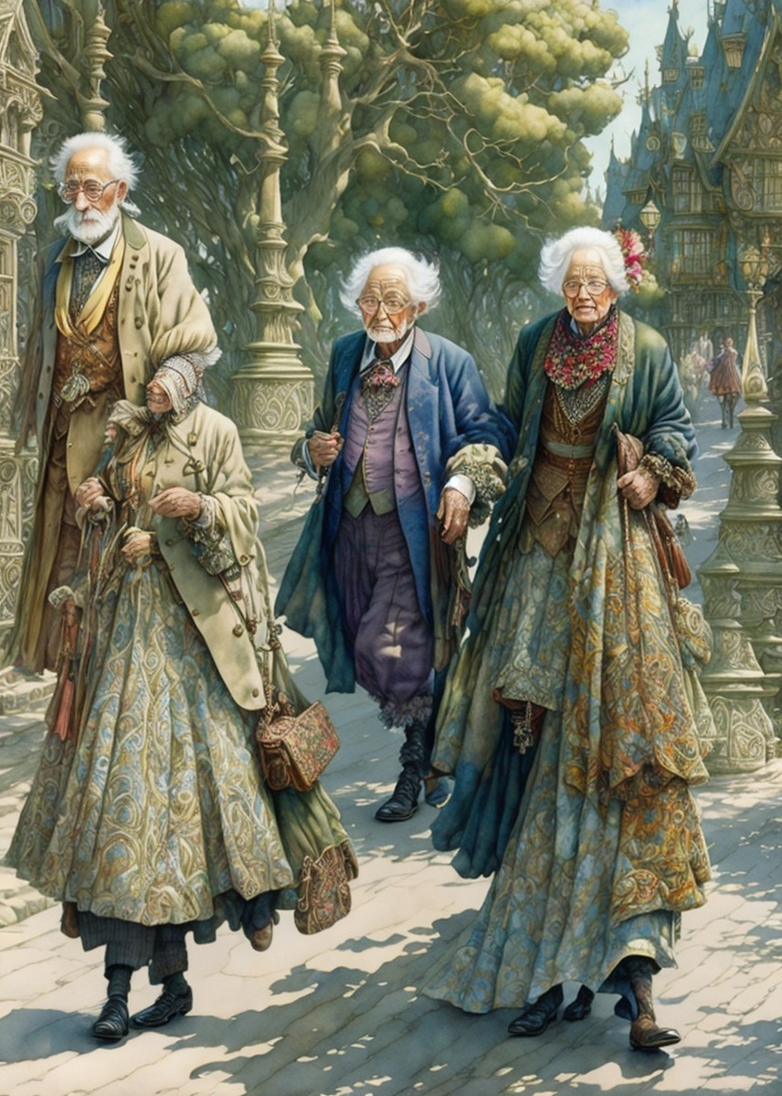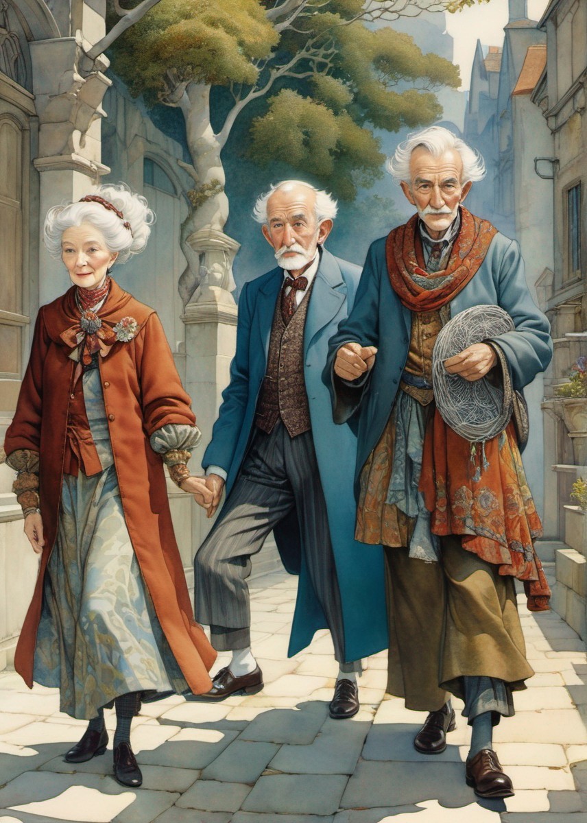 Three elderly individuals walk together in a quaint cobblestone street, dressed in colorful vintage attire, radiating warm, sophisticated charm.