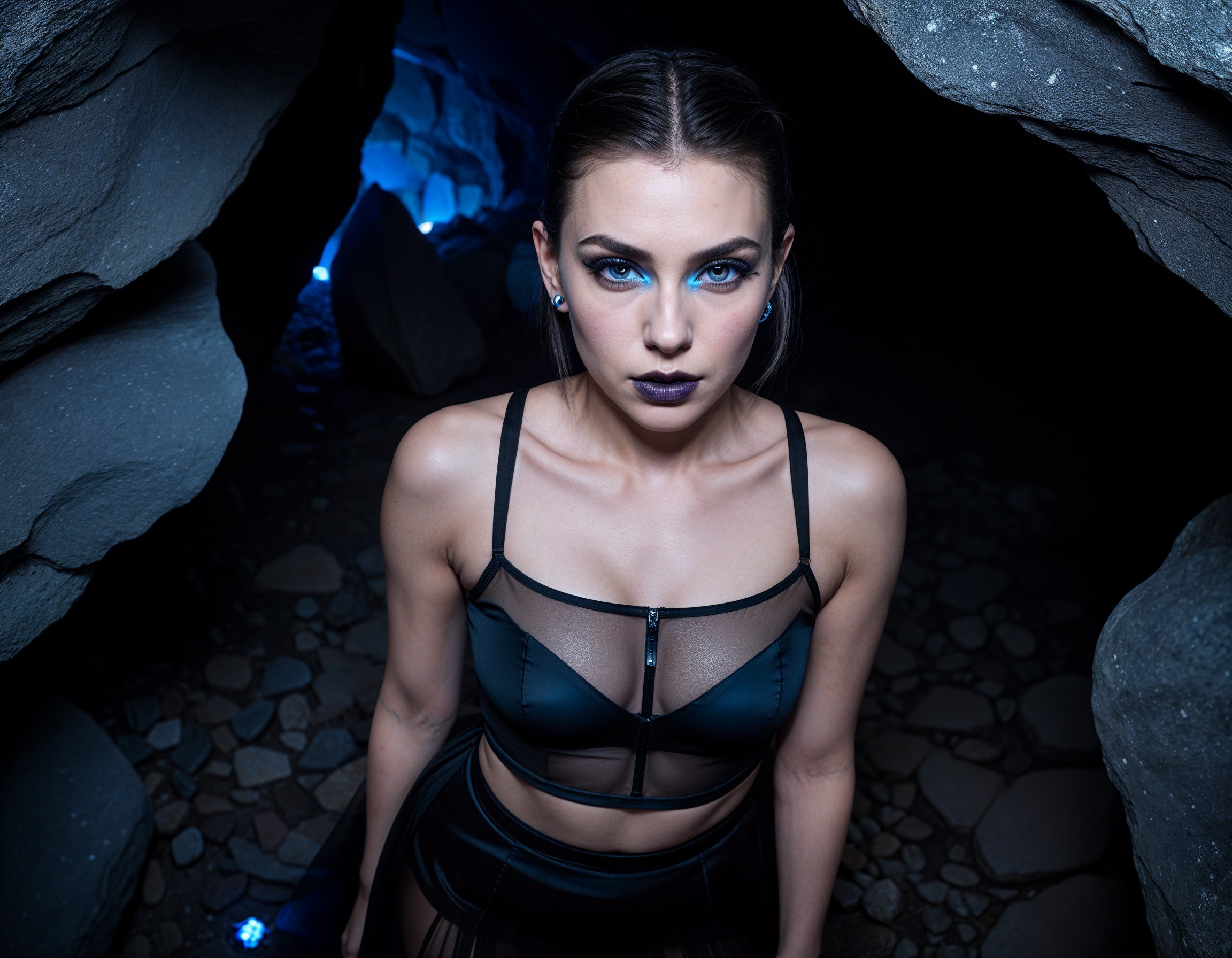 Prompt: A beautiful female, master of the dark arts, seen from above in a birds-eye view, dressed in a short, black sheer skirt and a small sheer croptop, a background of bare rock cave, looks straight at the viewer, she has dark eye shadow and gothic makeup, facial piercings in her nose and eyebrows, amidst a moody, dark atmosphere, with soft, blue light spilling from some holes in the cave, casting intricate shadows and illuminating her delicate body, reminiscent of the style of WLOP from ArtStation, with an emphasis on surreal, hyper-realistic elements and an dark, moody ambiance. Perspective is above the woman looking down.