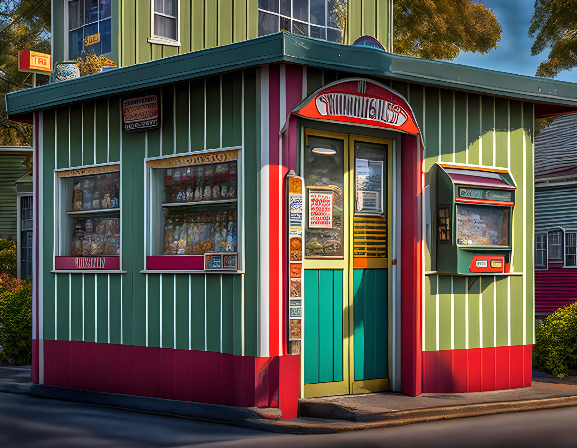 Colorful Corner Shop with Vintage Posters and Striped Walls